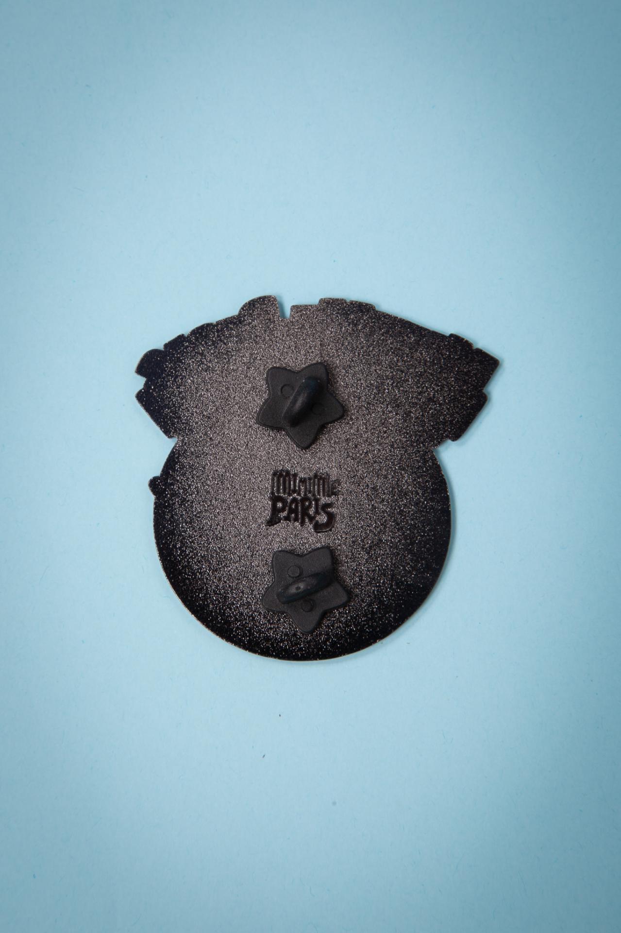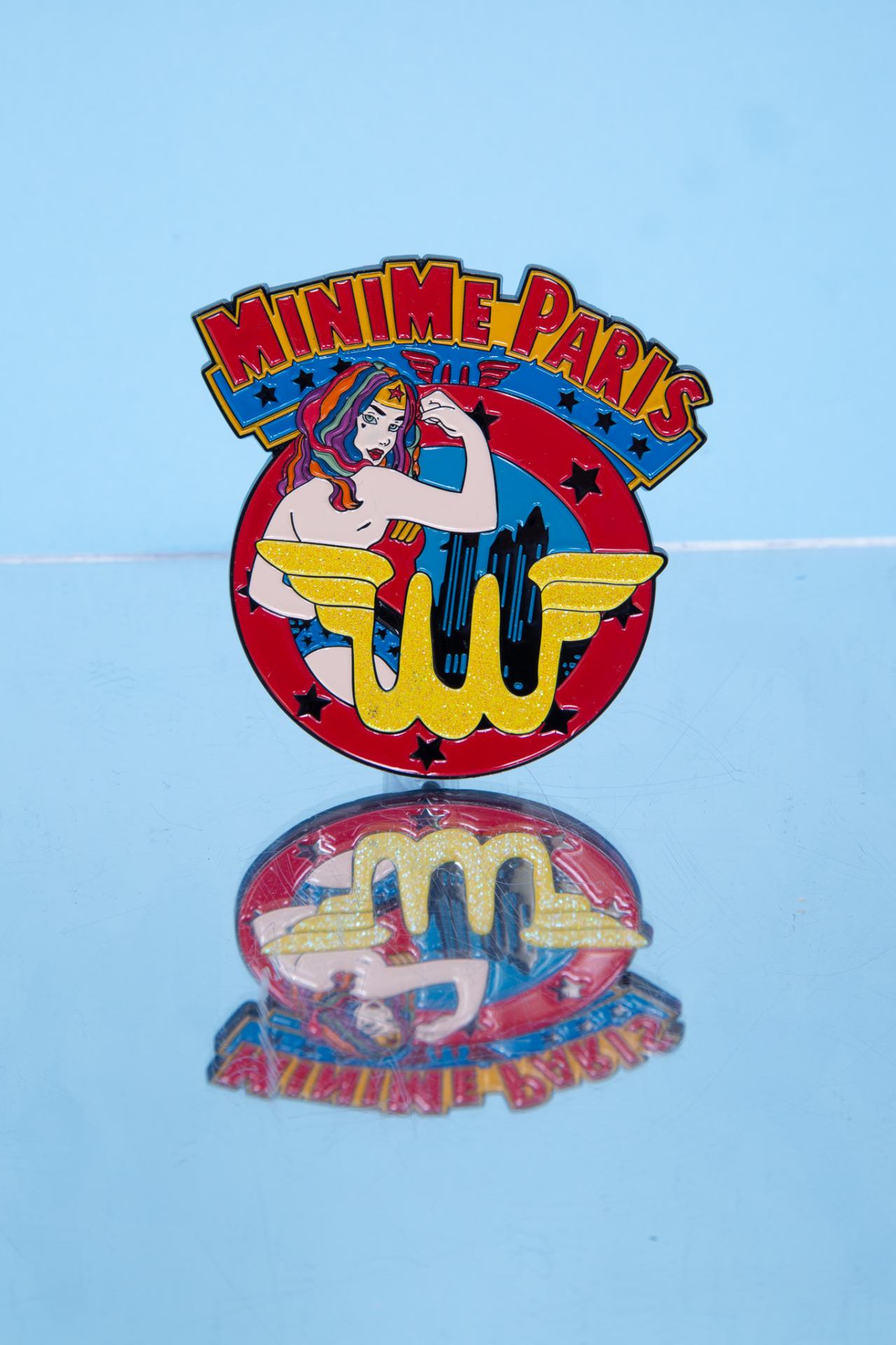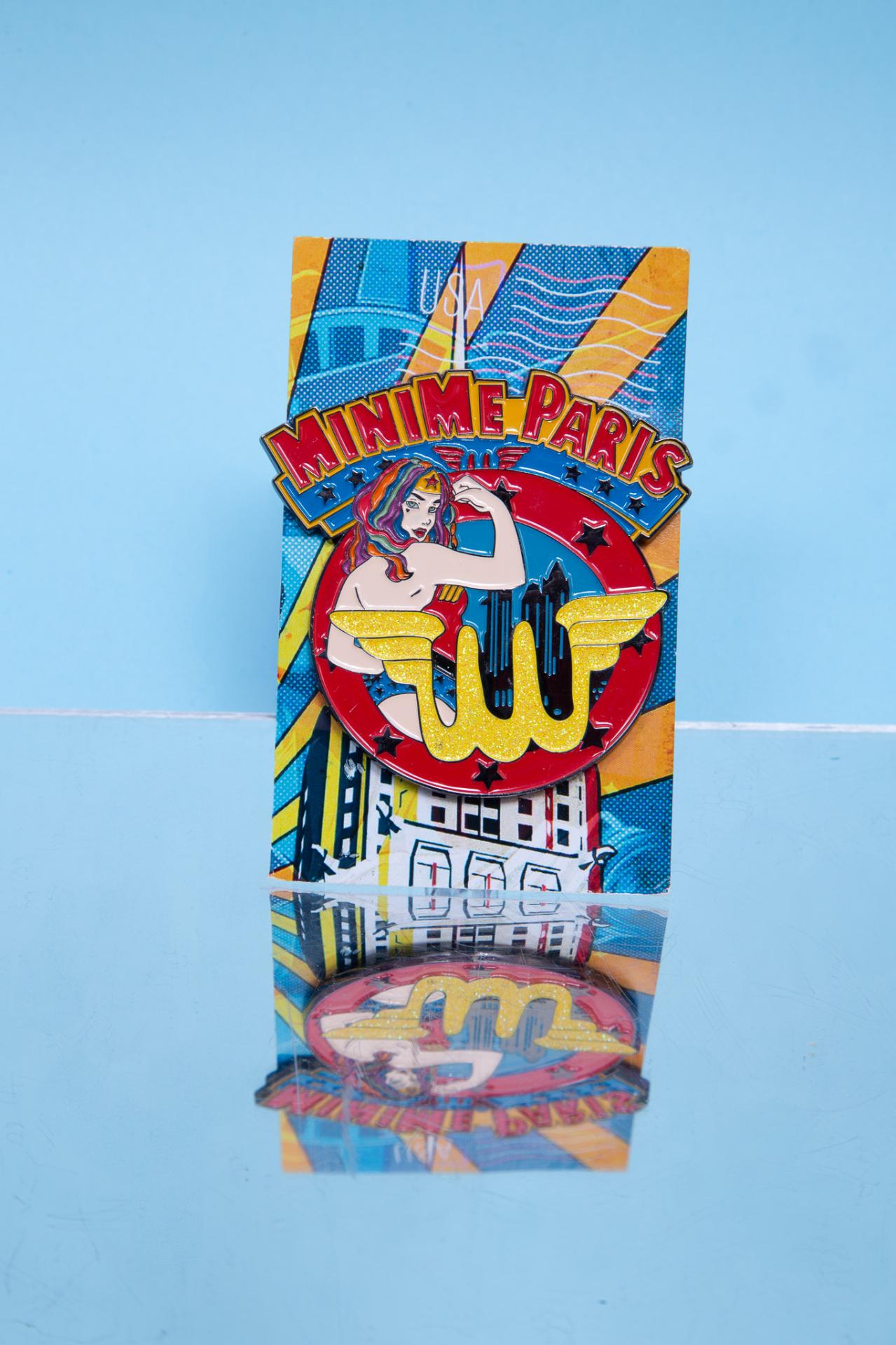 A colorful enamel pin featuring a strong retro inspired heroine with bright hair and bold graphic elements.