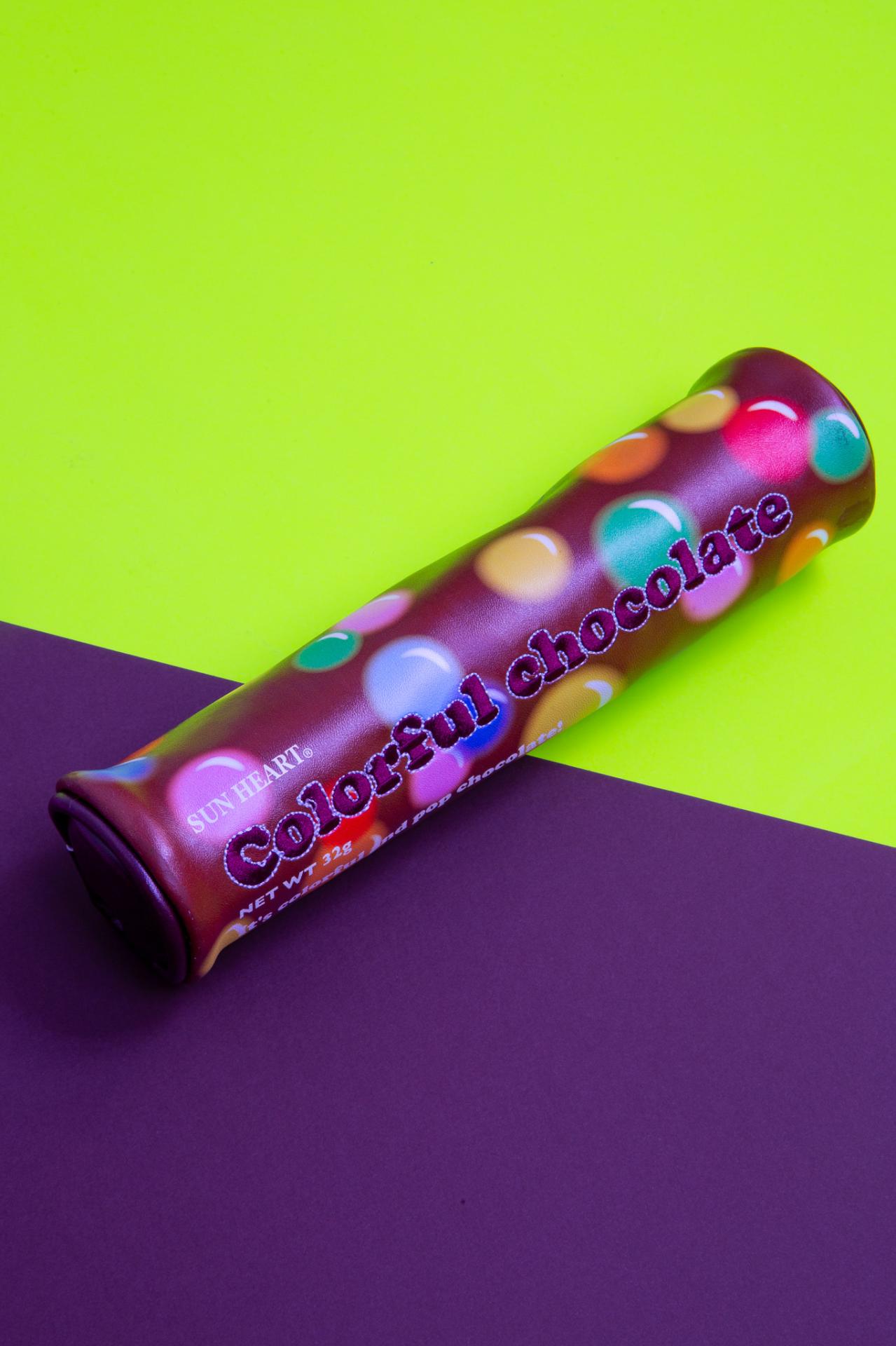The ChocoPop Pouch looks just like a tube of colorful chocolate candies, making it a sweet and quirky accessory for everyday use. With its glossy finish, bright candy-dot pattern, and cylindrical shape, it stands out as both fun and functional.