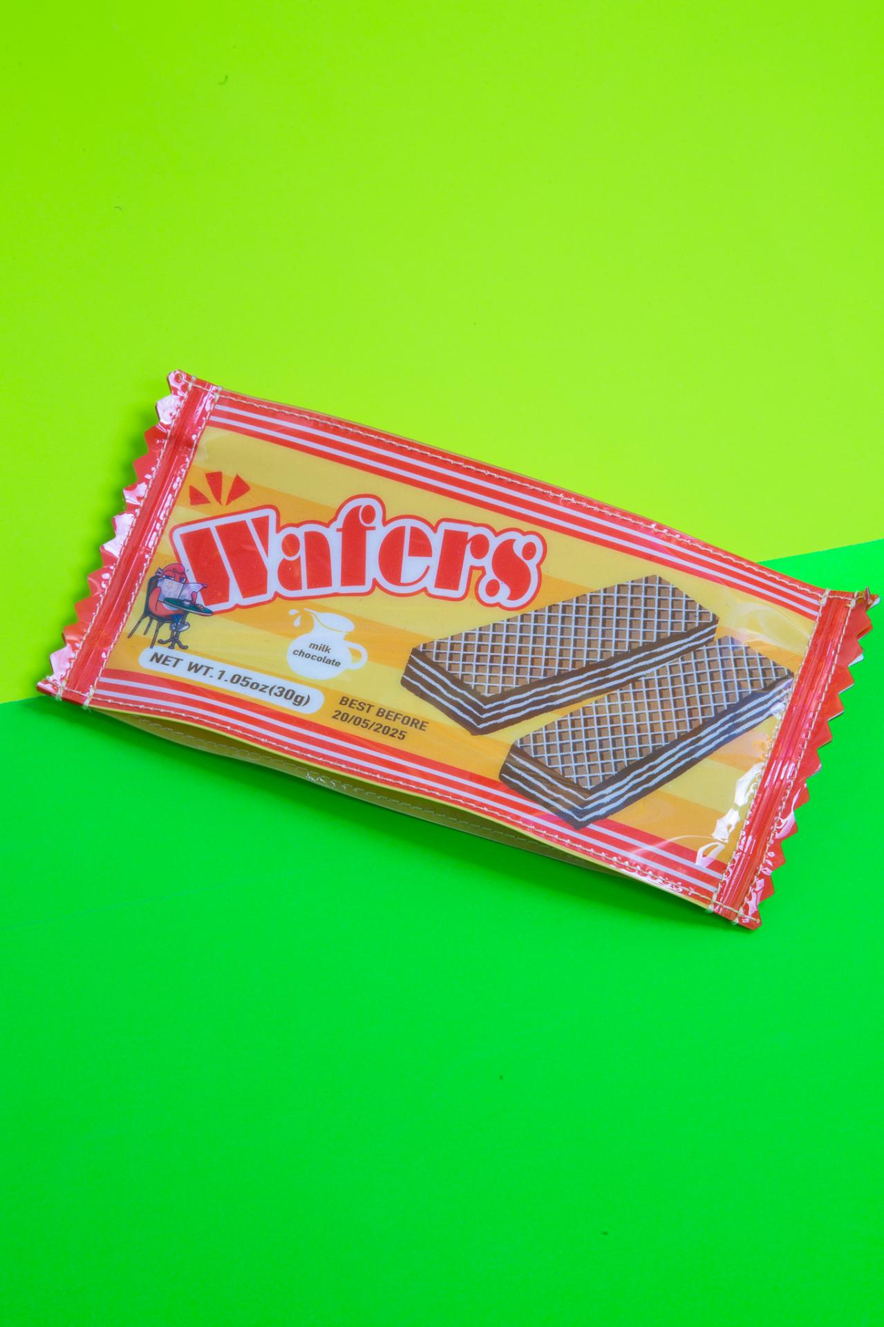 The Wafers Pouch looks just like a classic wafer cookie pack, complete with crinkled-edge detailing, retro graphics, and delicious-looking wafer illustrations. This playful design brings a sweet touch of nostalgia to your everyday accessories.