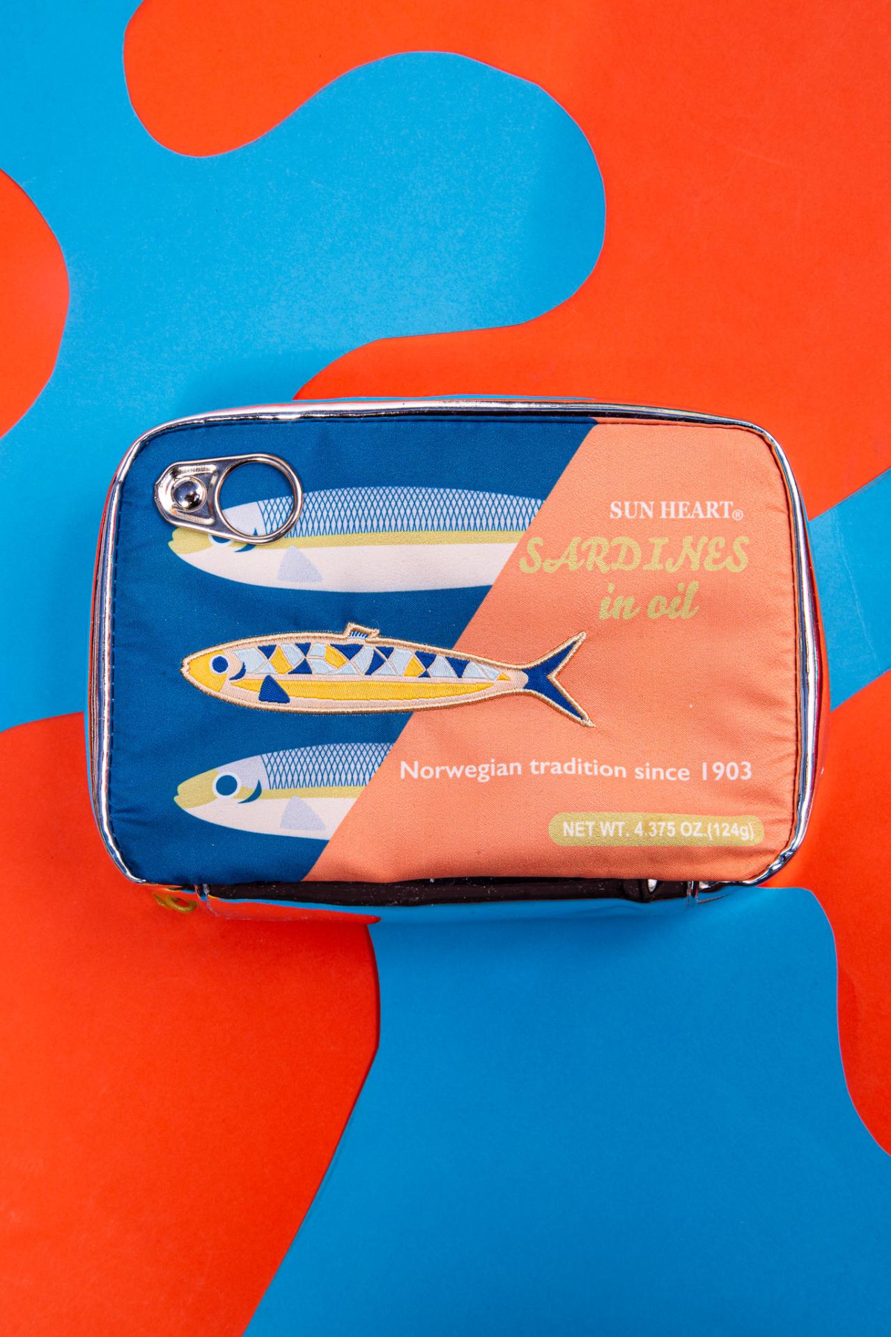 A quirky pouch shaped like a vintage sardine tin—colorful, fun, and perfect for storing small essentials with a playful twist.