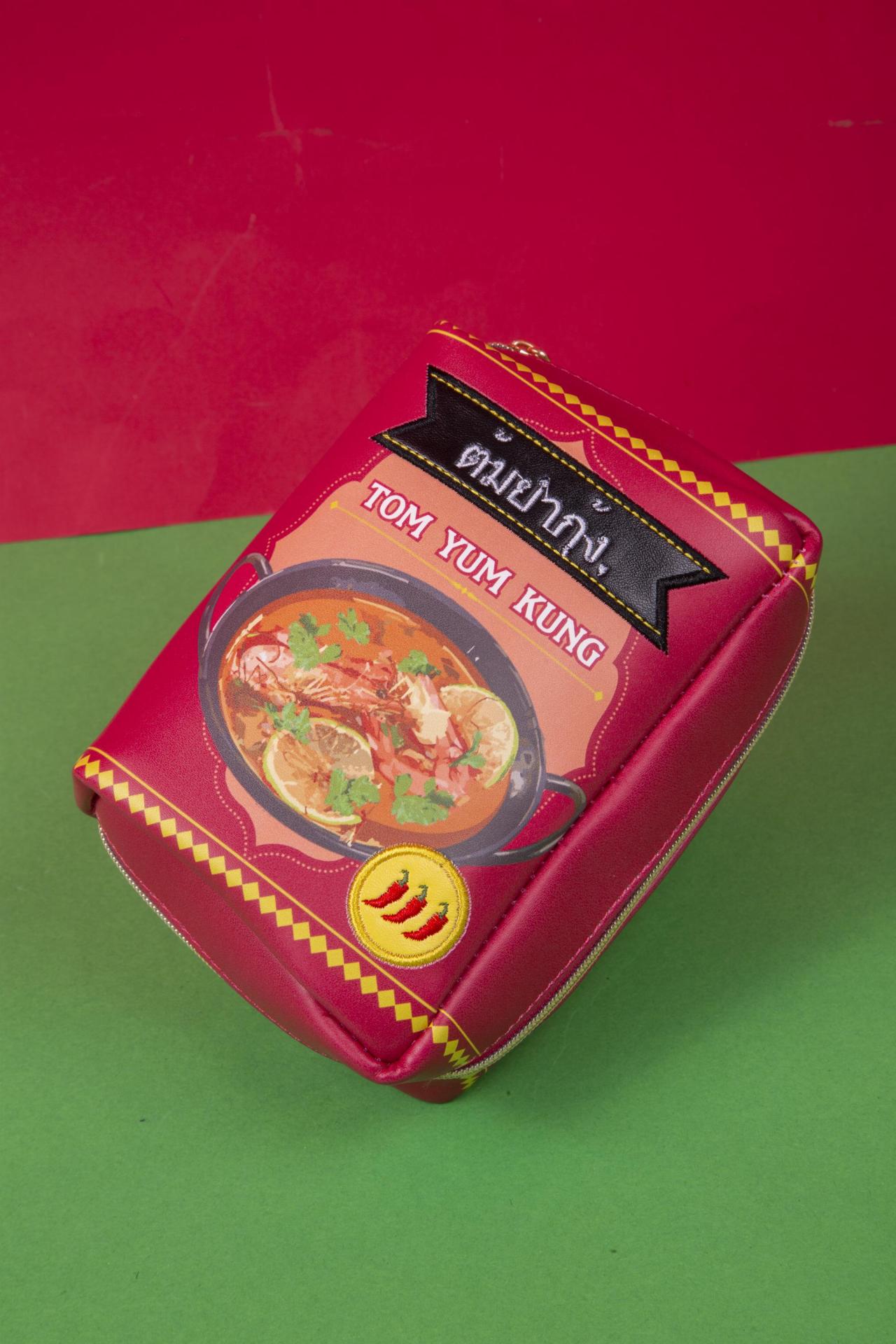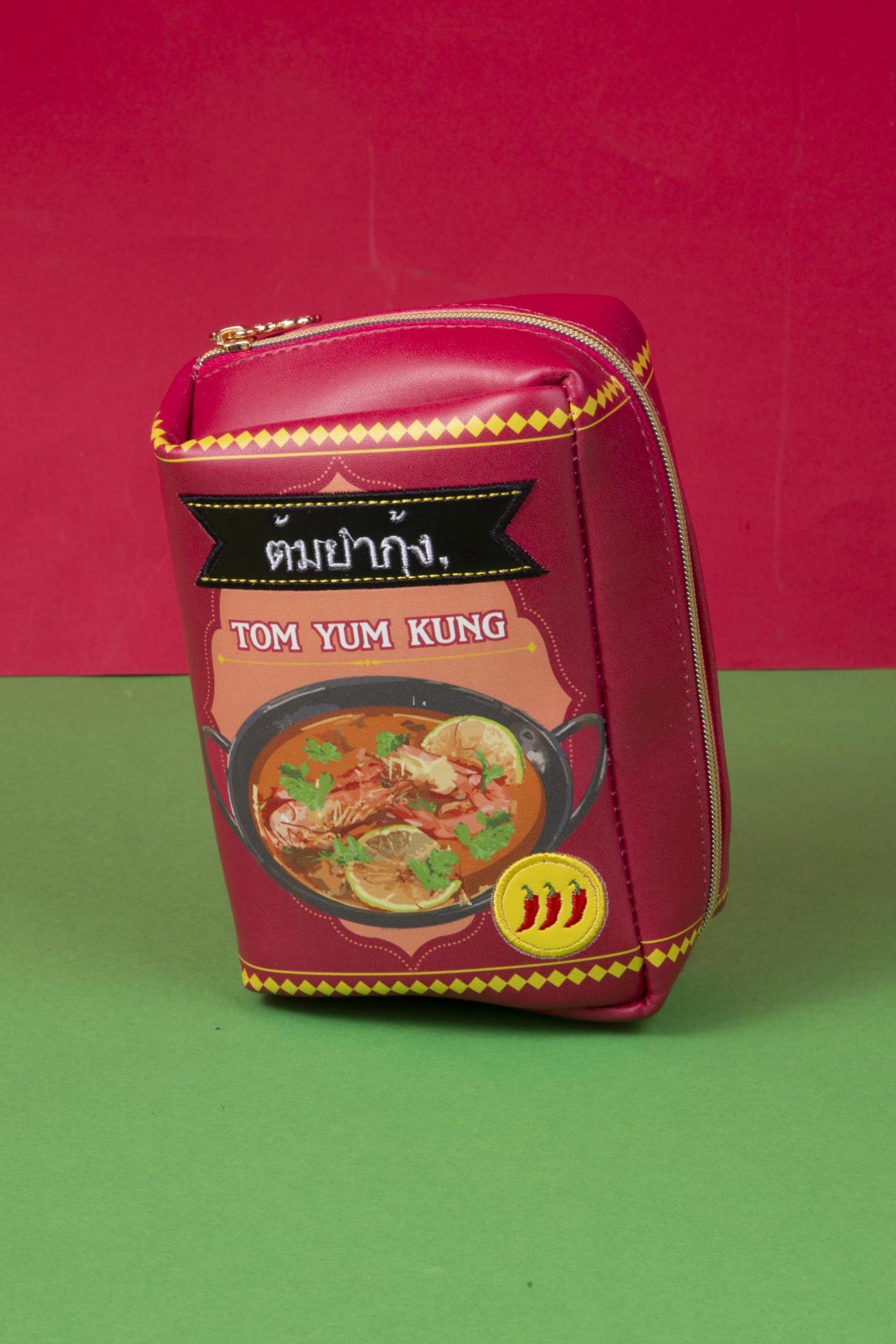 The Tom Yum Pouch brings the heat of Thailand’s most iconic soup into your accessories collection. Designed to look like a Tom Yum Kung instant noodle packet, it features rich red tones, chili icons, Thai script, and a delicious bowl illustration that gives it an authentic foodie look.