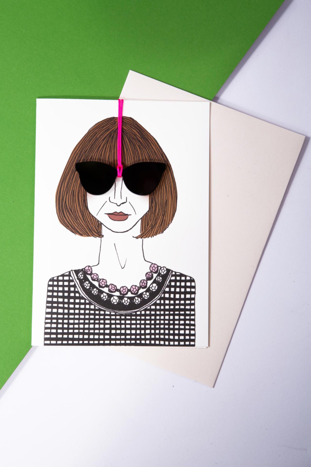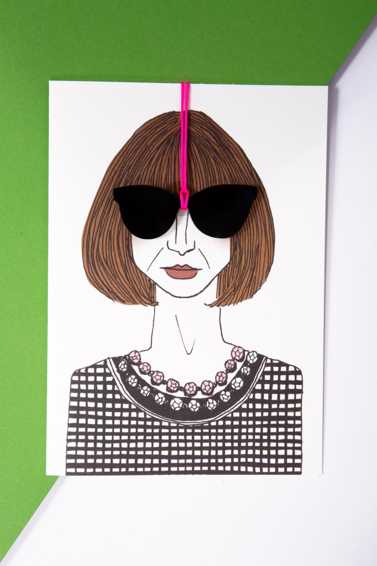 A chic postcard featuring a stylized illustration of Anna Wintour with her signature bob, statement necklace, and removable black sunglasses on a bright pink cord.