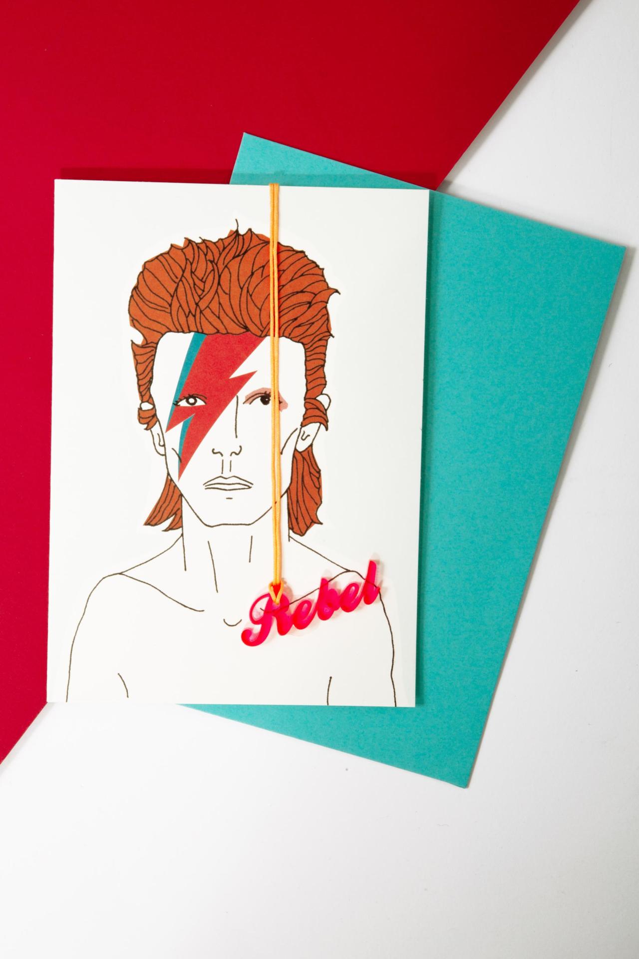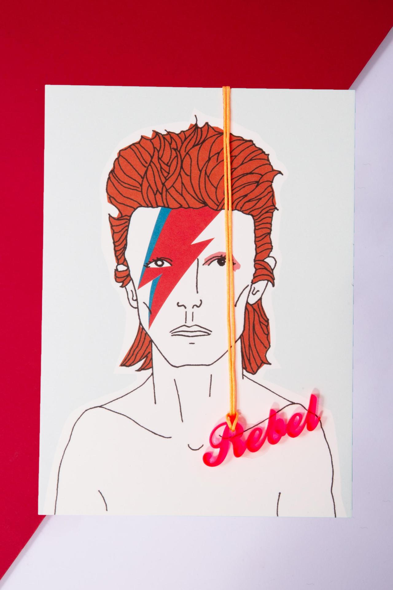 A bold postcard featuring an illustrated character with vivid red hair, a lightning-bolt face design, and a removable “Rebel” necklace in bright red.