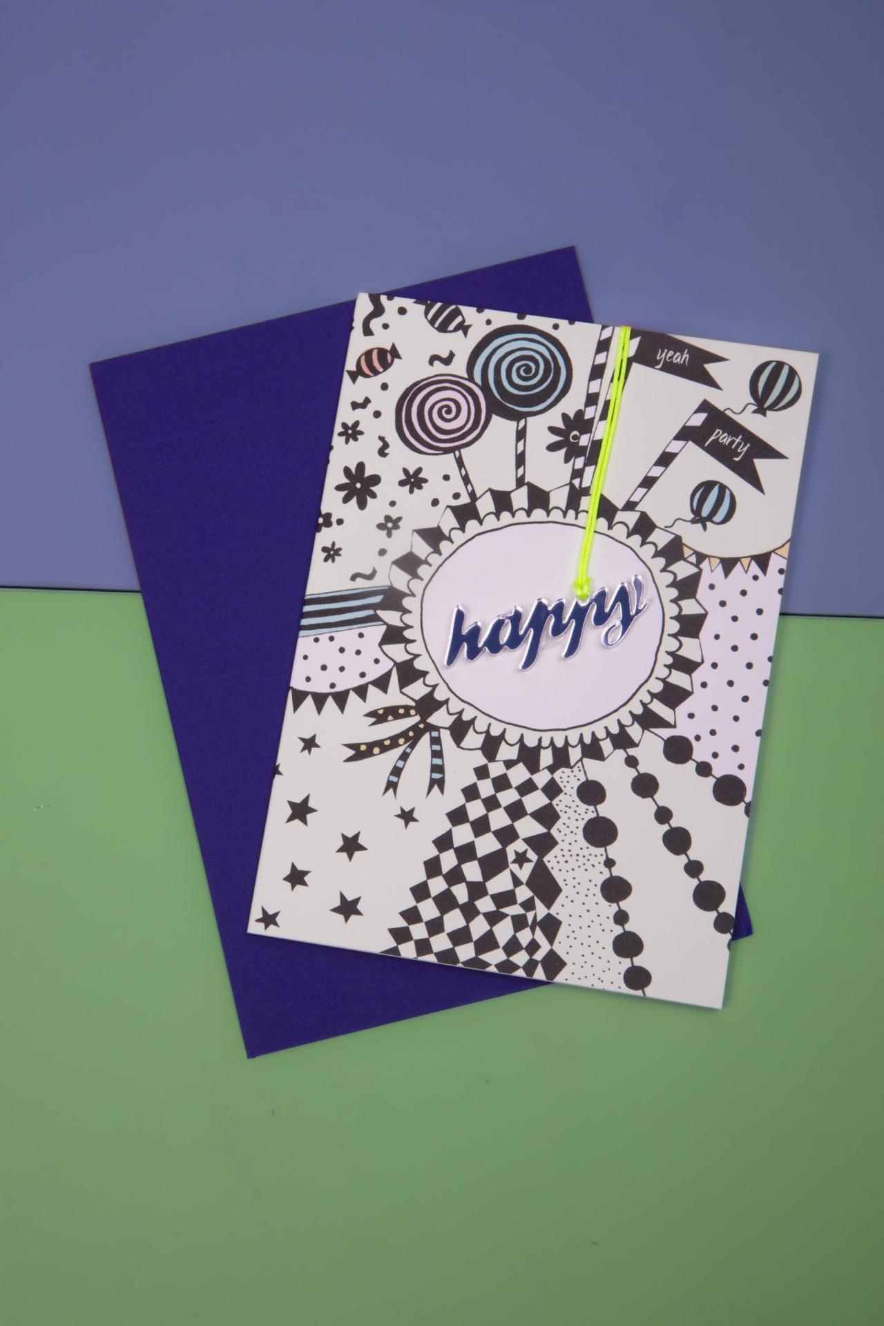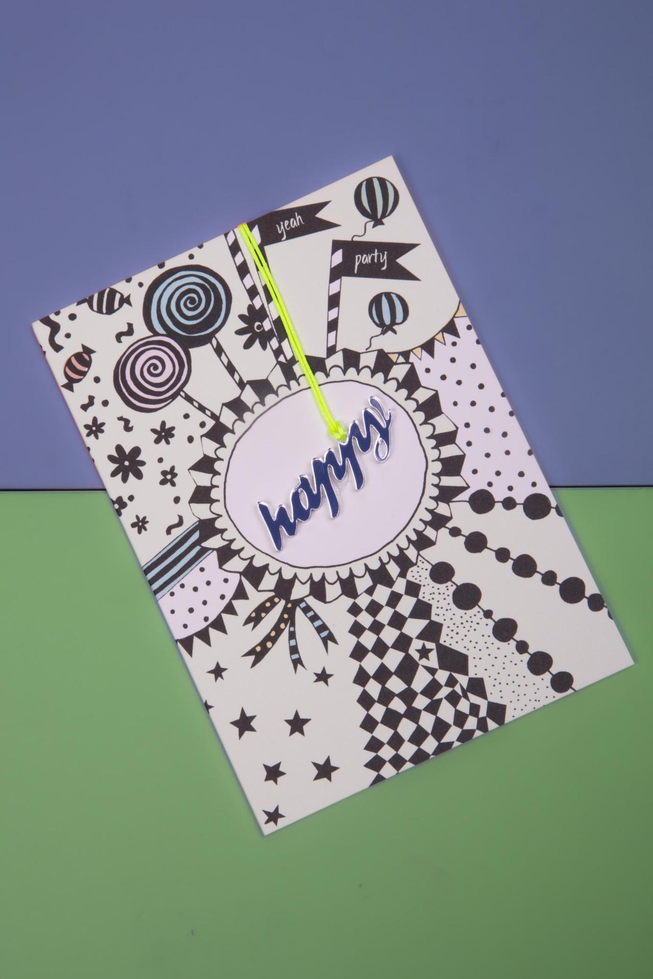 A playful postcard with a mix of black-and-white patterns, festive icons, and a removable blue “happy” charm hanging from a neon yellow cord.