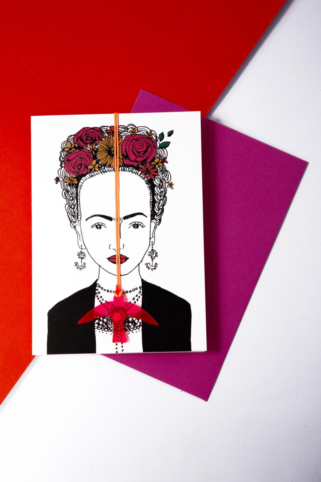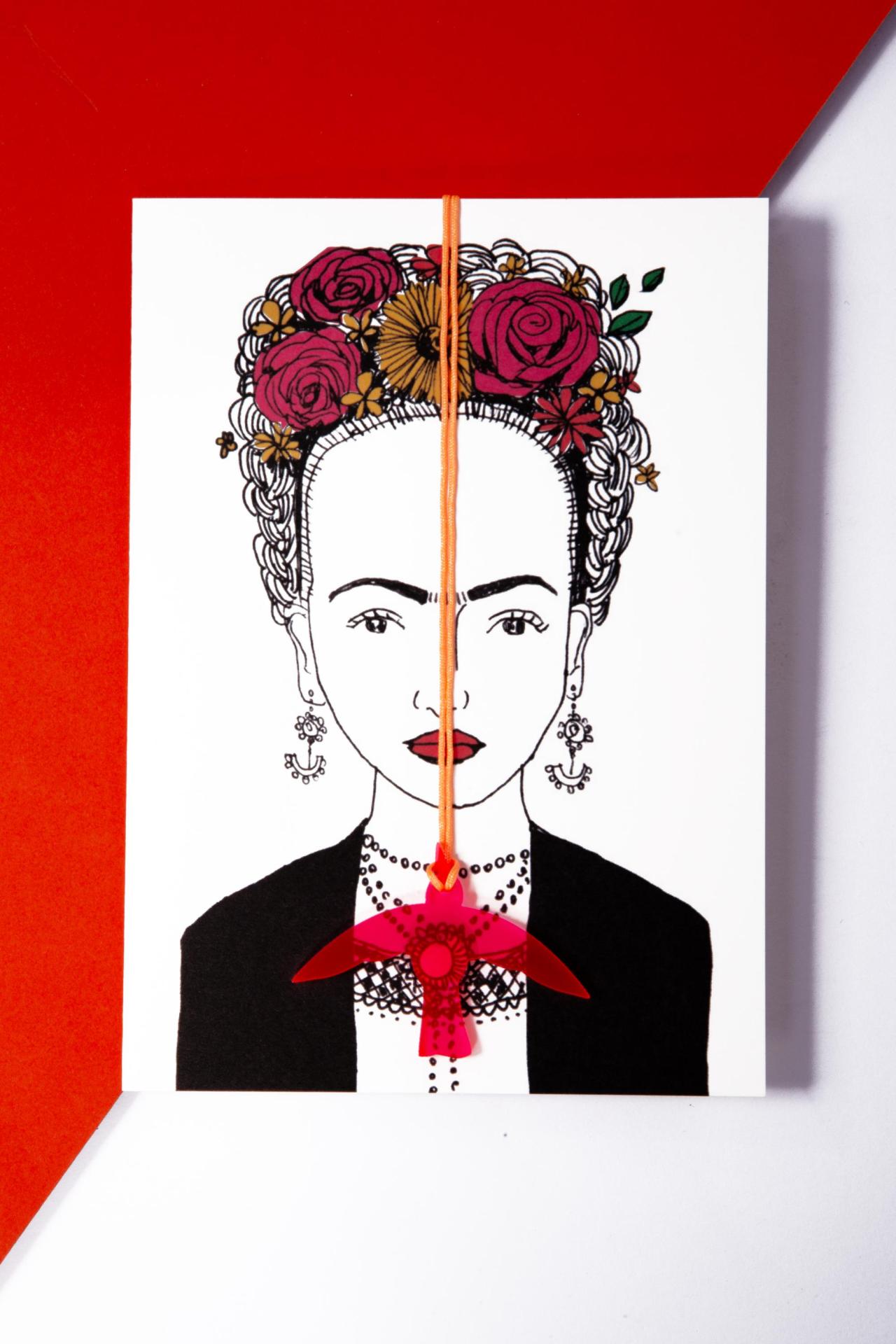 A striking Frida-inspired postcard featuring a black-and-white portrait accented with a vibrant floral crown and a removable red necklace charm.