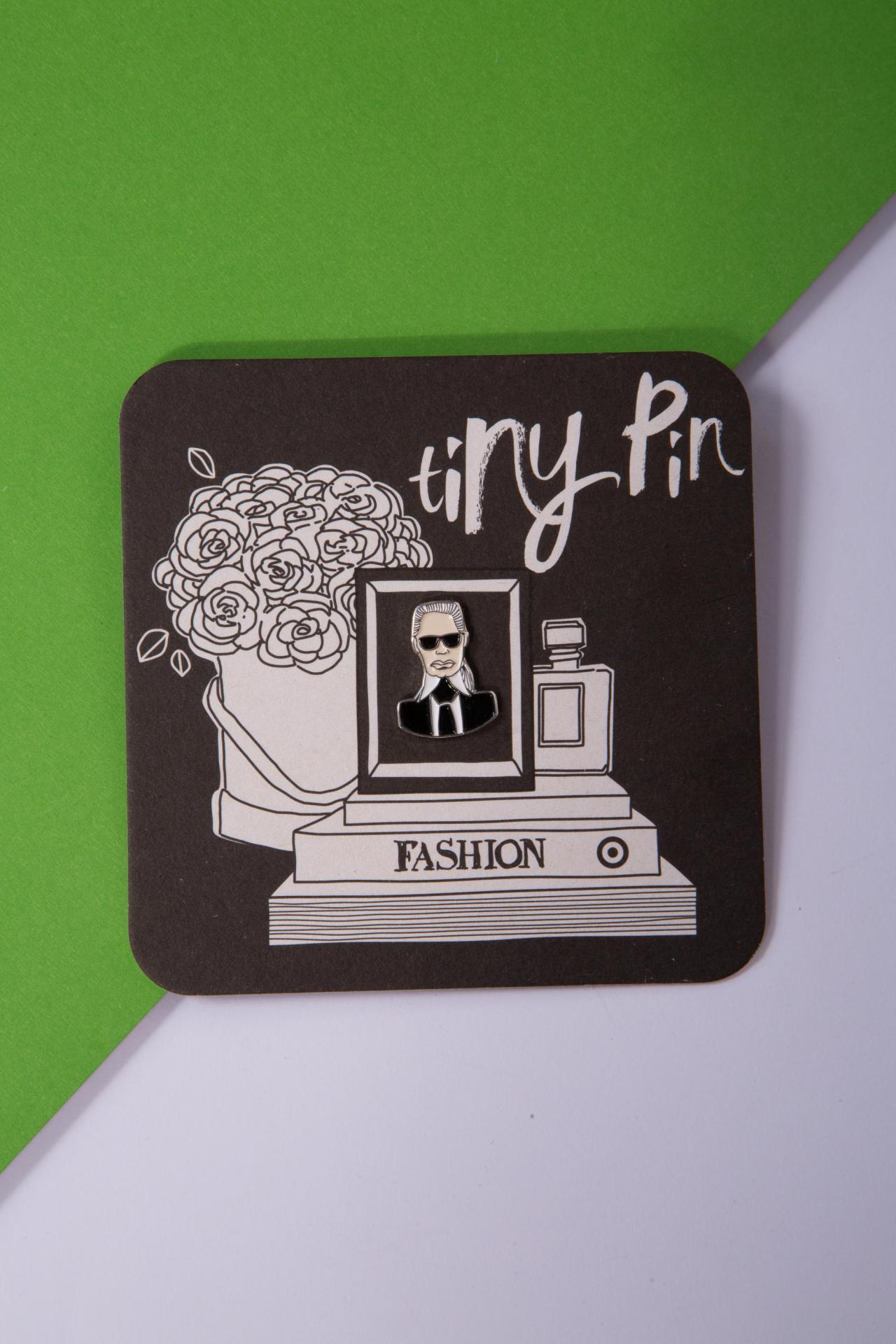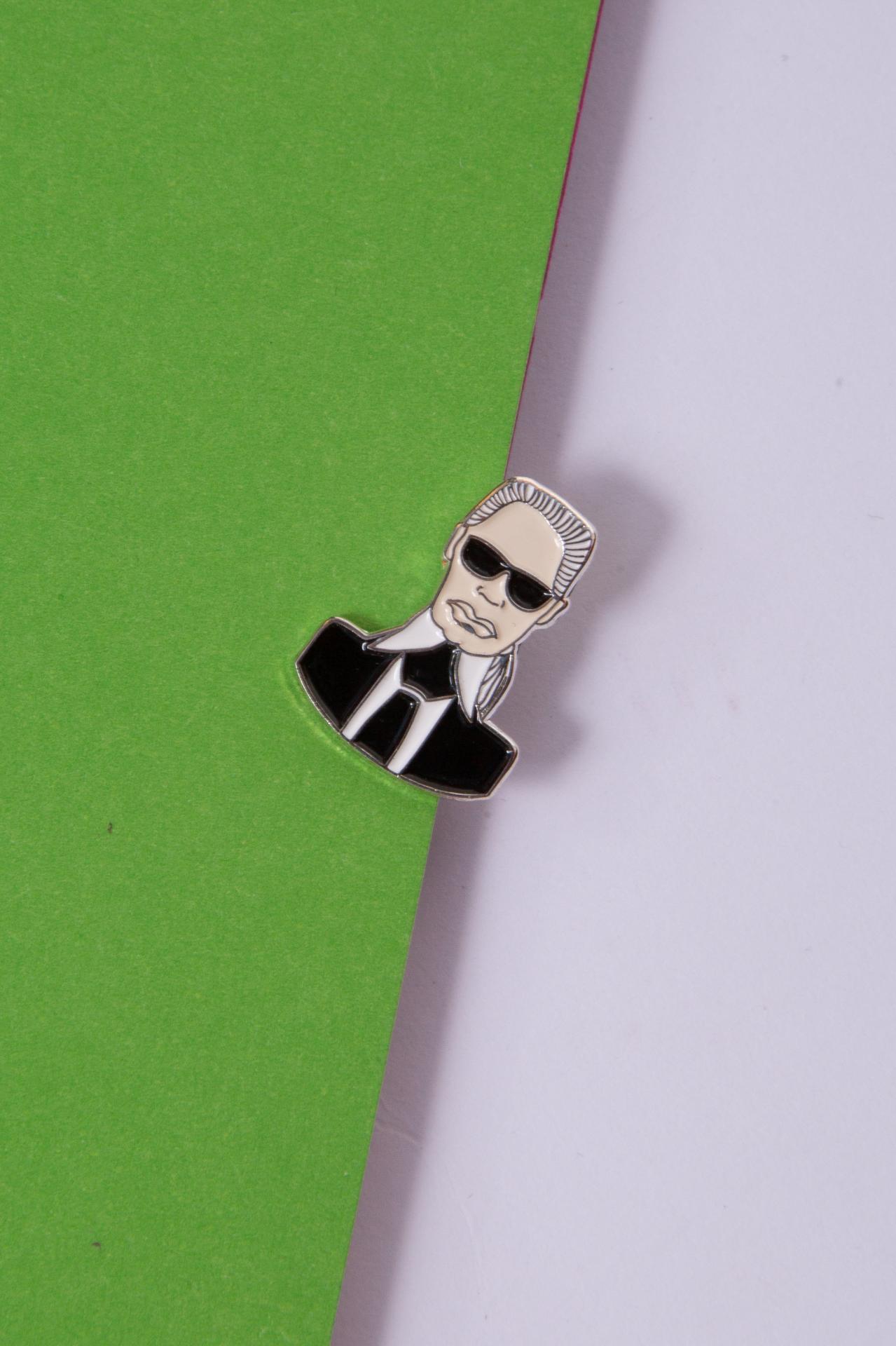 A stylish illustrated postcard featuring a miniature Karl Lagerfeld pin framed like a fashion icon portrait. A chic and collectible accessory for fashion lovers.