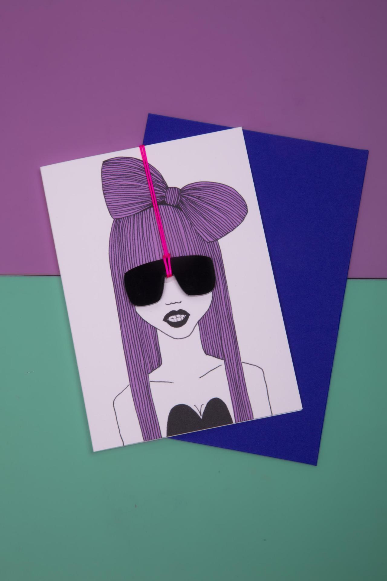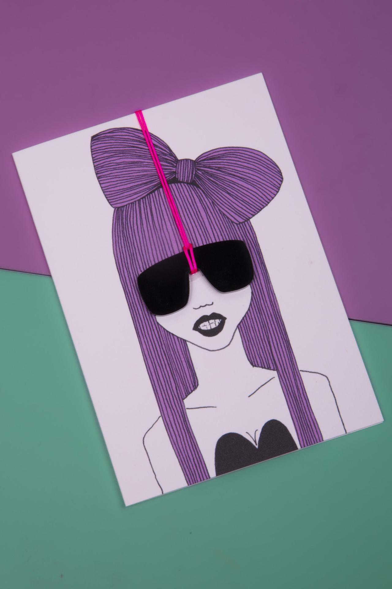 A bold postcard featuring an illustrated character with long lavender hair, an oversized bow, and removable black sunglasses on a bright pink cord.