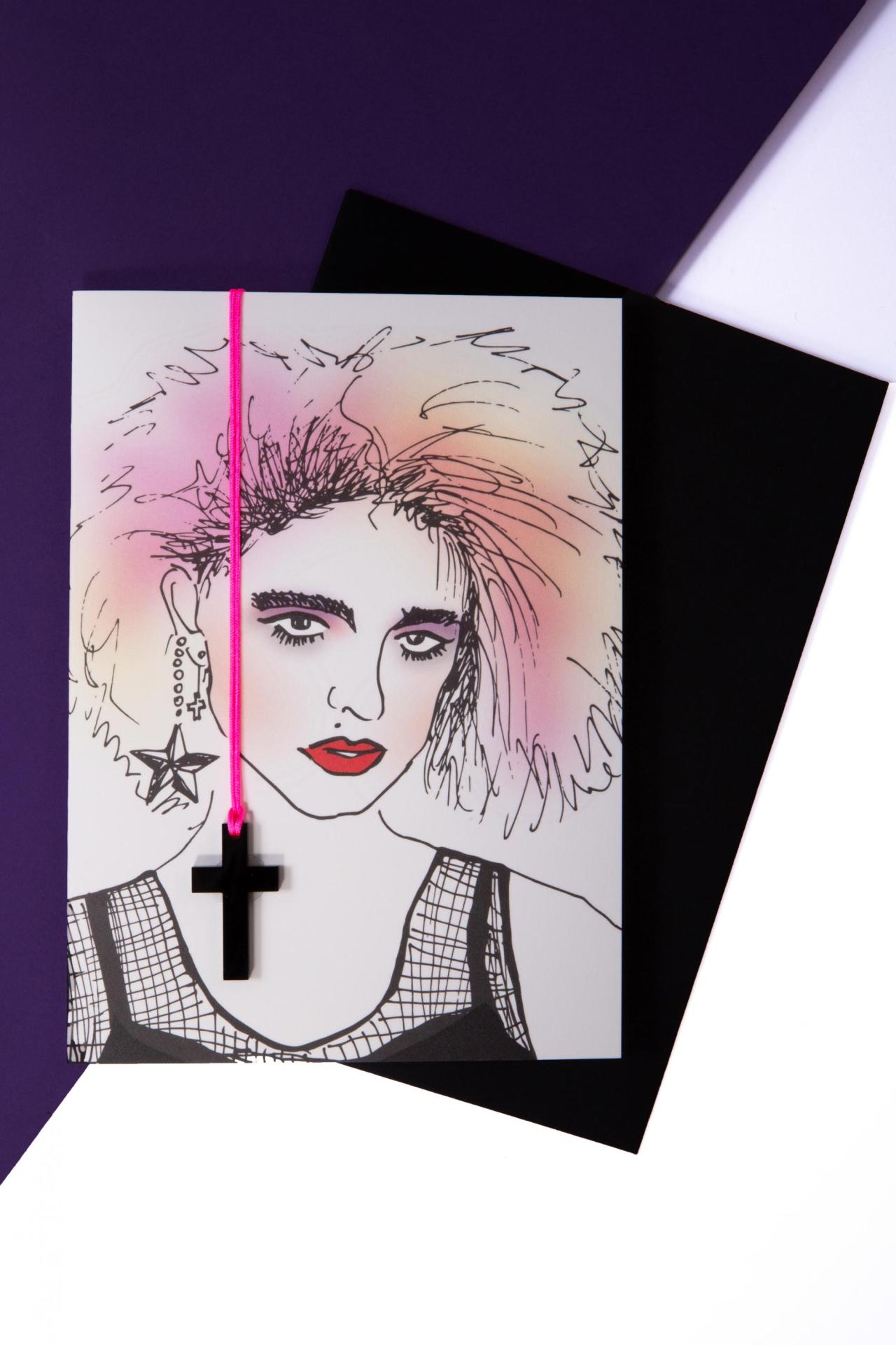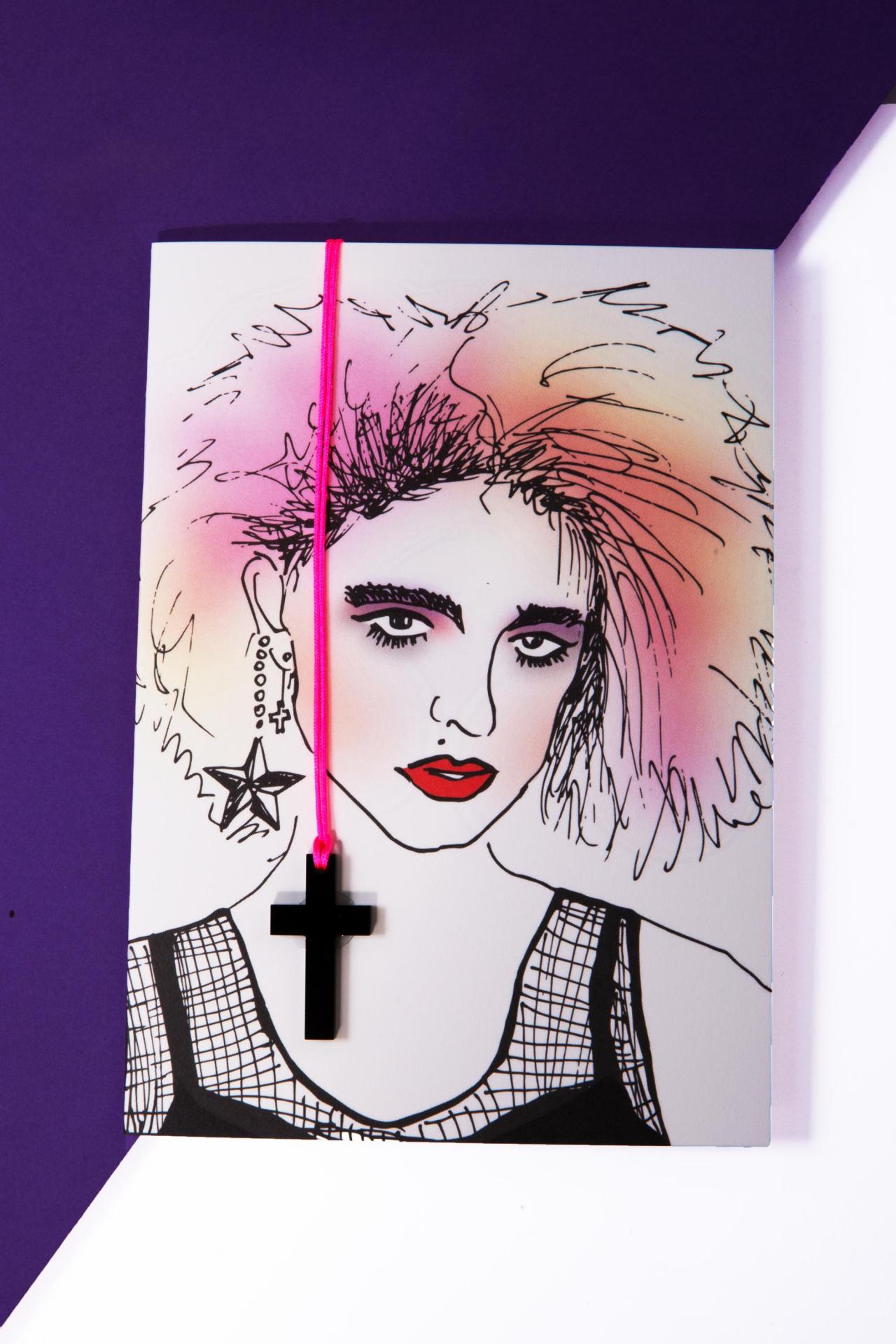 A vibrant postcard featuring a bold illustrated portrait with ’80s-inspired hair, vivid makeup, and a removable black cross necklace on a hot-pink cord.