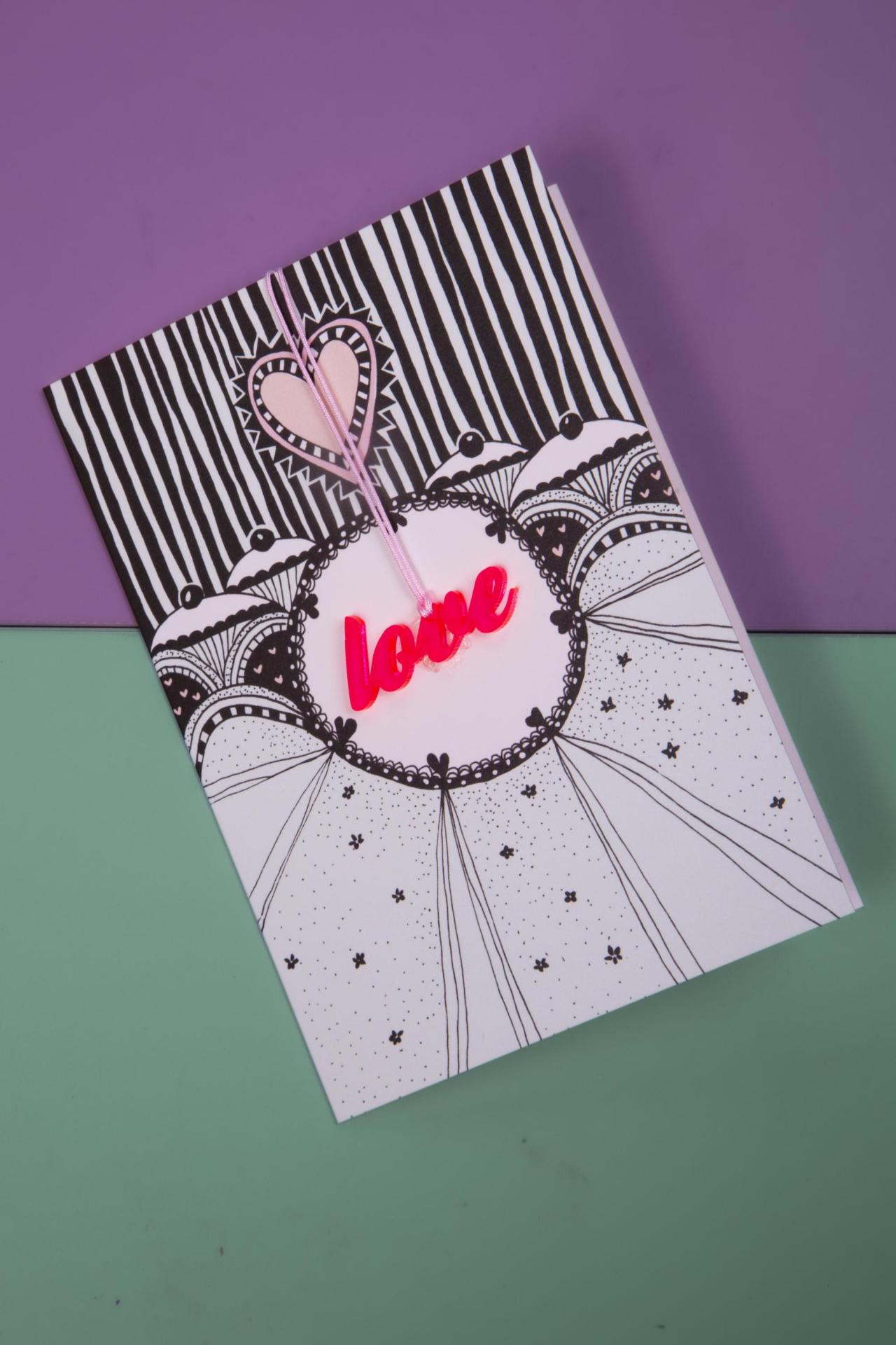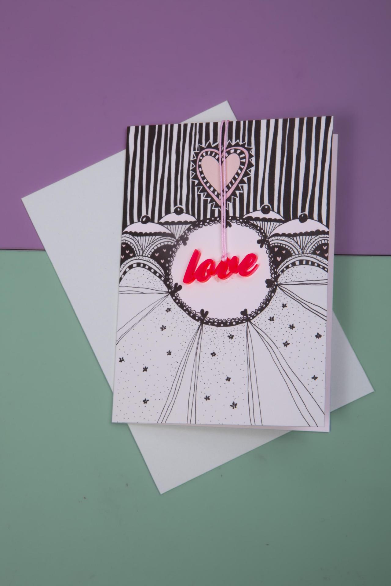 A romantic postcard with a detailed black-and-white Parisian-inspired illustration and a bright pink “love” charm hanging from a matching pink cord.