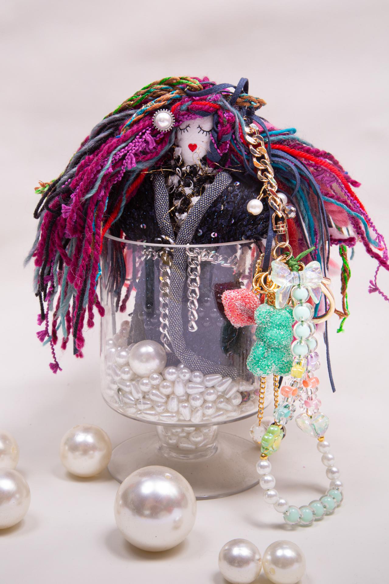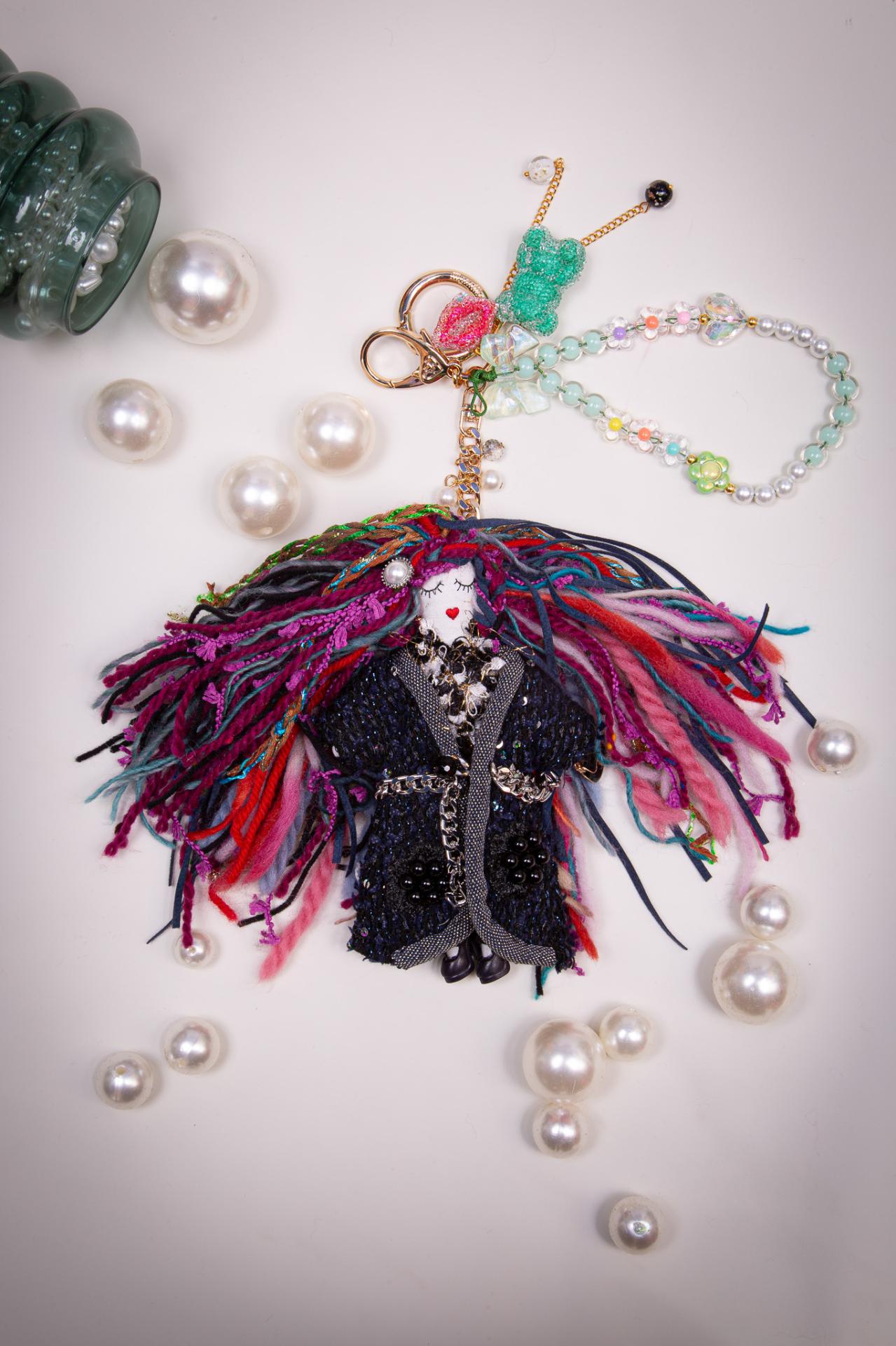 A bold, hand-crafted Gunny doll key holder featuring multicolor yarn hair, a dark sequin outfit, pearl accents, and playful dangling charms. A statement collectible full of edgy, artistic flair.