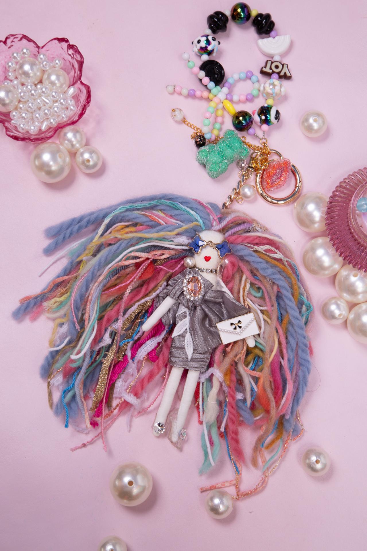 A hand-crafted Vanessa doll key holder with multicolor yarn hair, a chic grey dress, pearl accents, and a tiny white handbag. A playful, fashionable collectible full of charm.