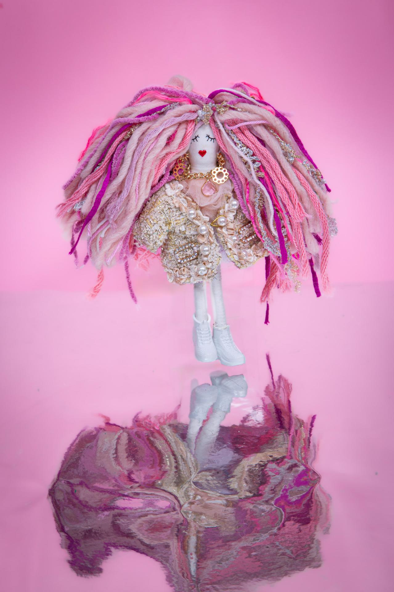 Unique, hand-stitched Margot doll with vintage lace and pastel ribbon charm.