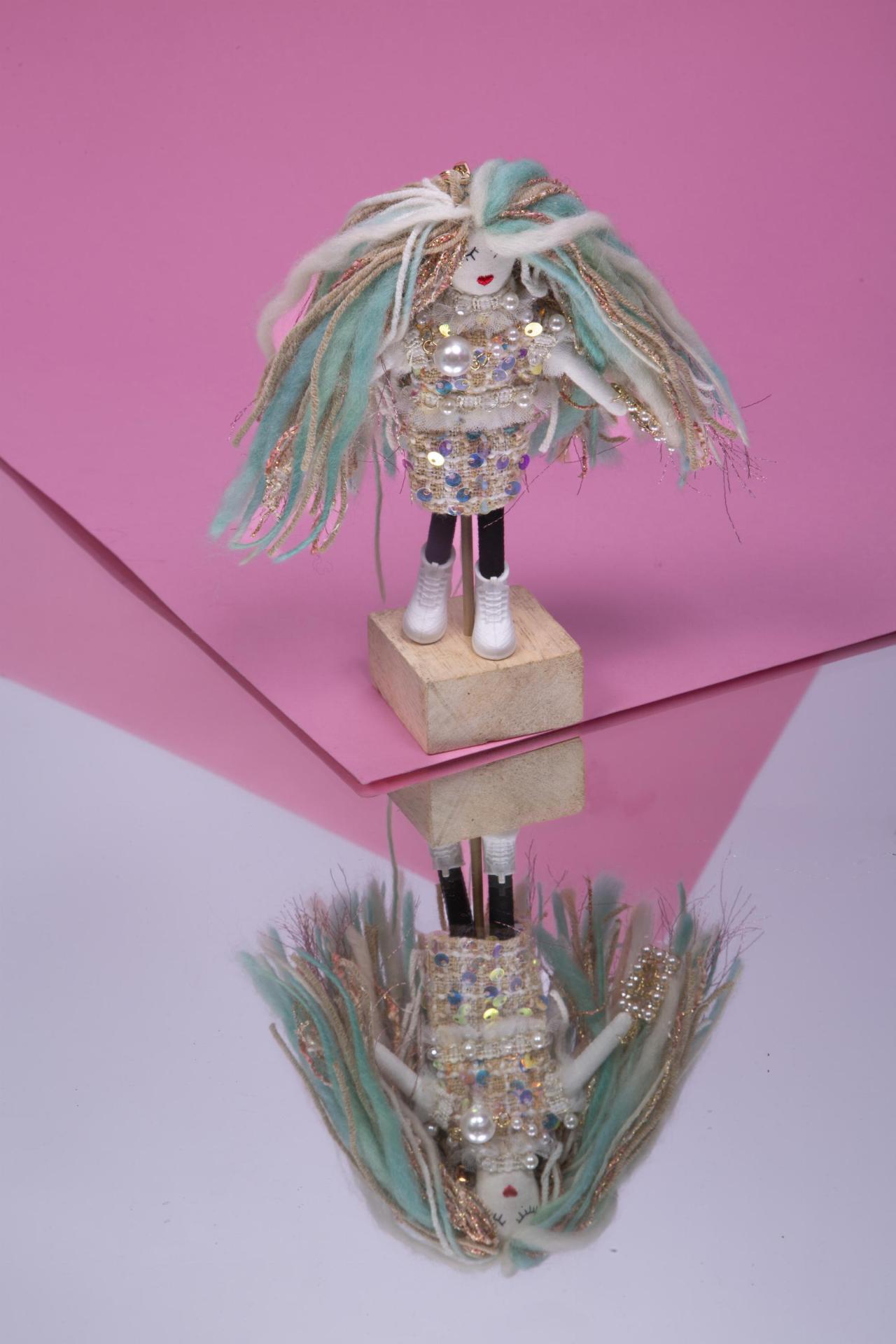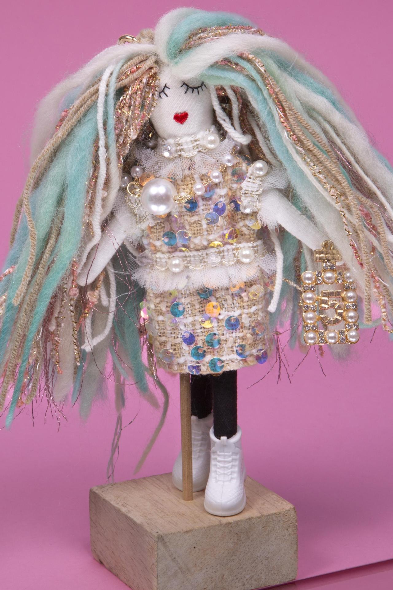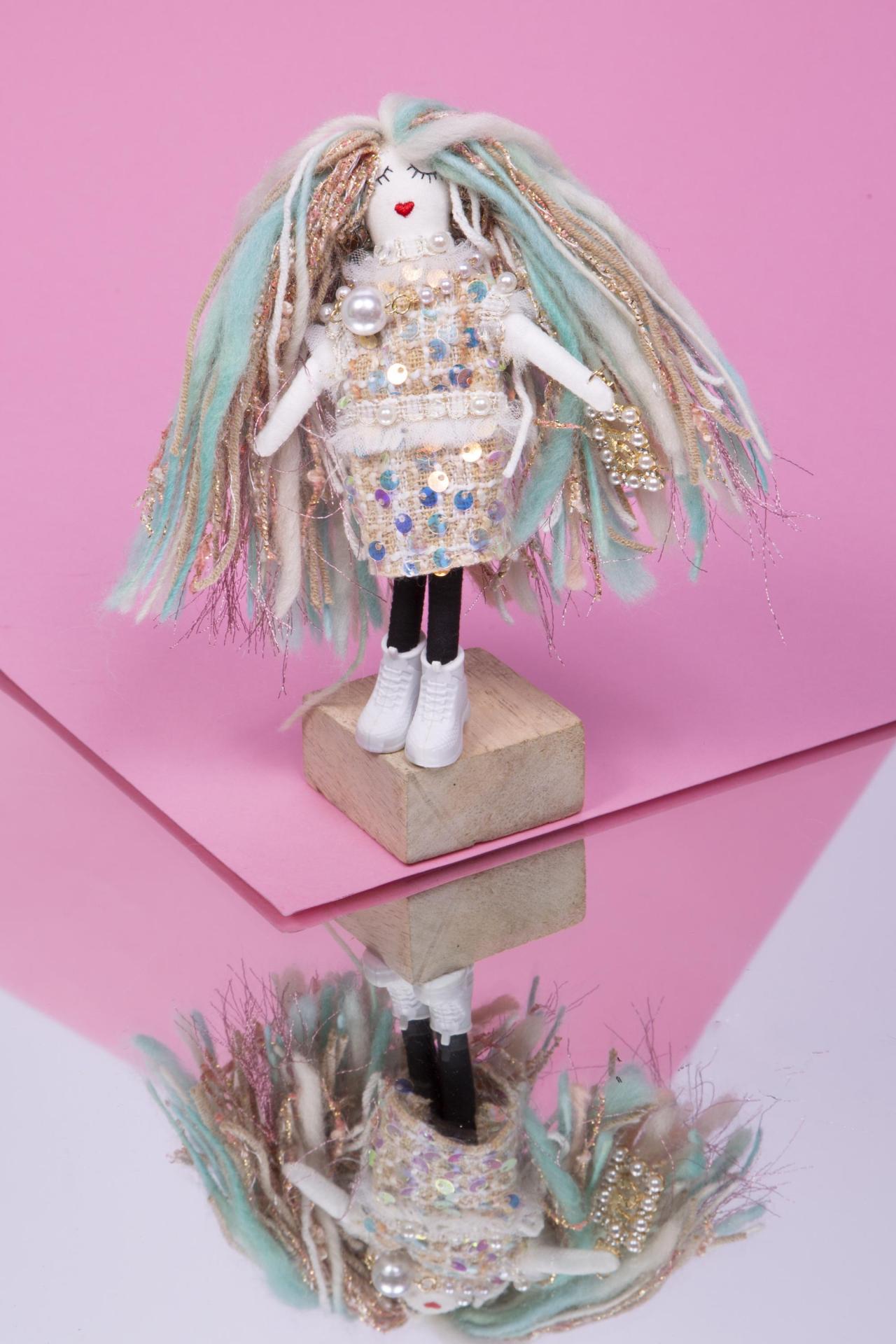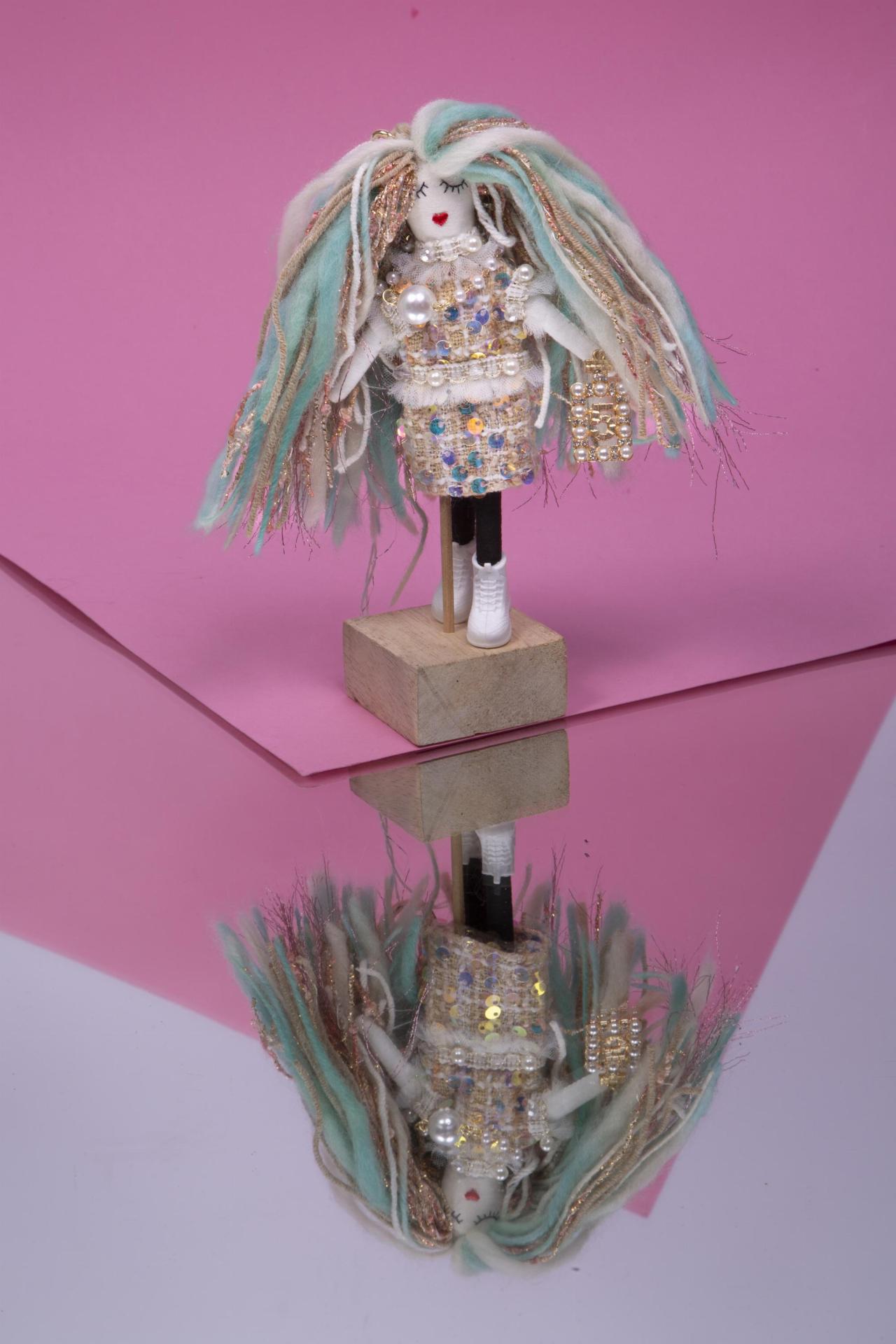 A hand-crafted Amalie doll key holder with soft pastel yarn hair, a pearl-studded embellished dress, and delicate gold accents. A dreamy, elegant collectible full of gentle sparkle.