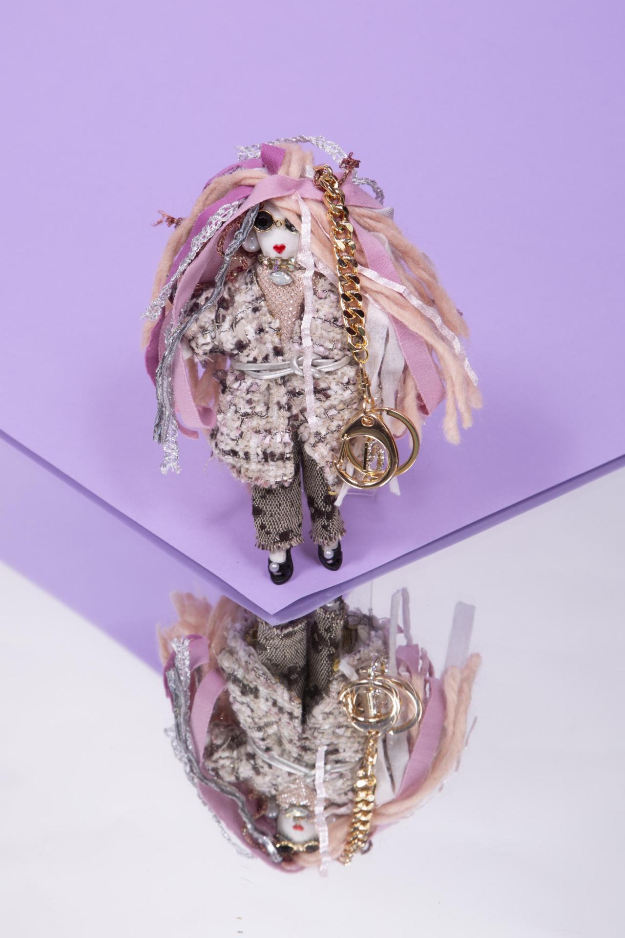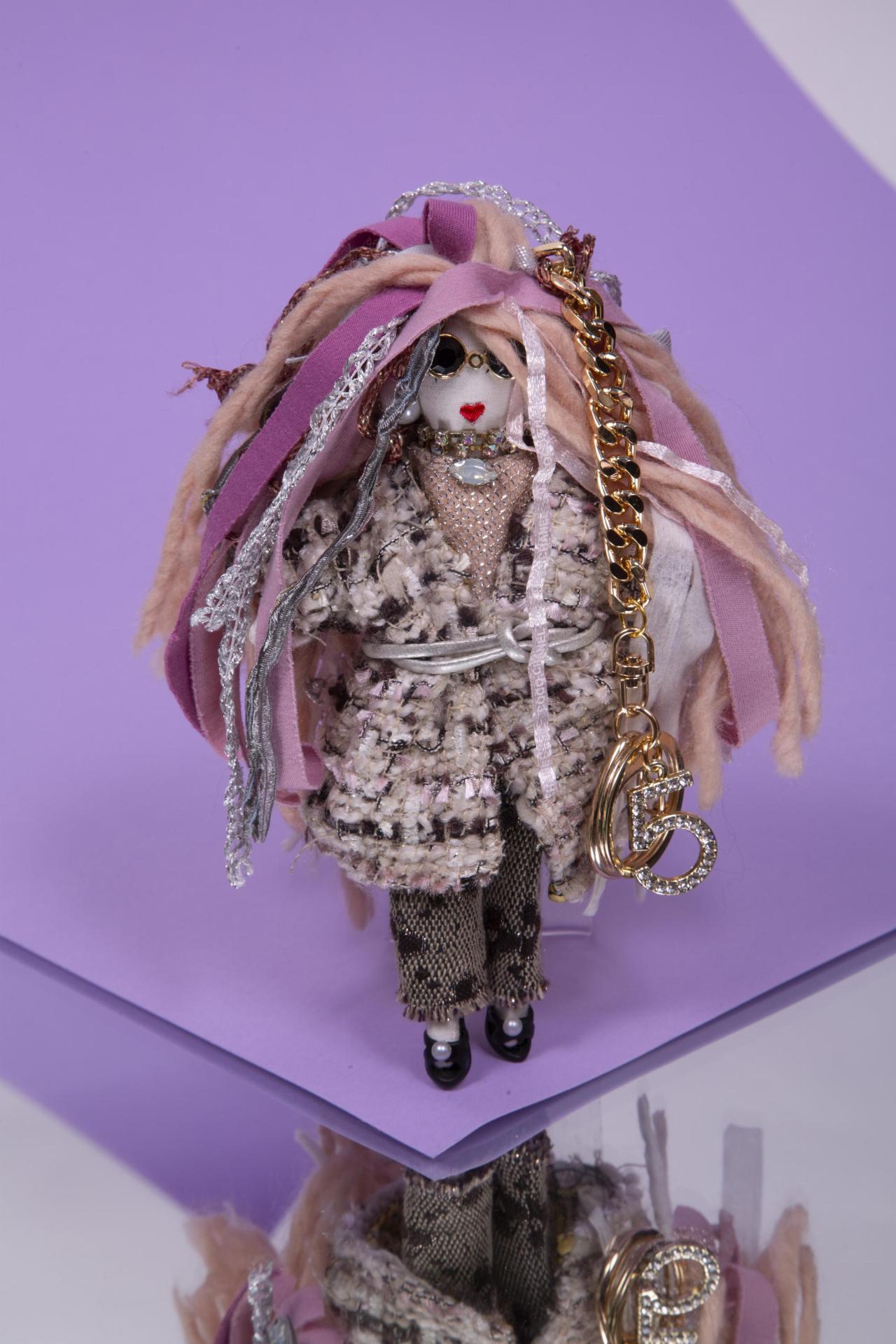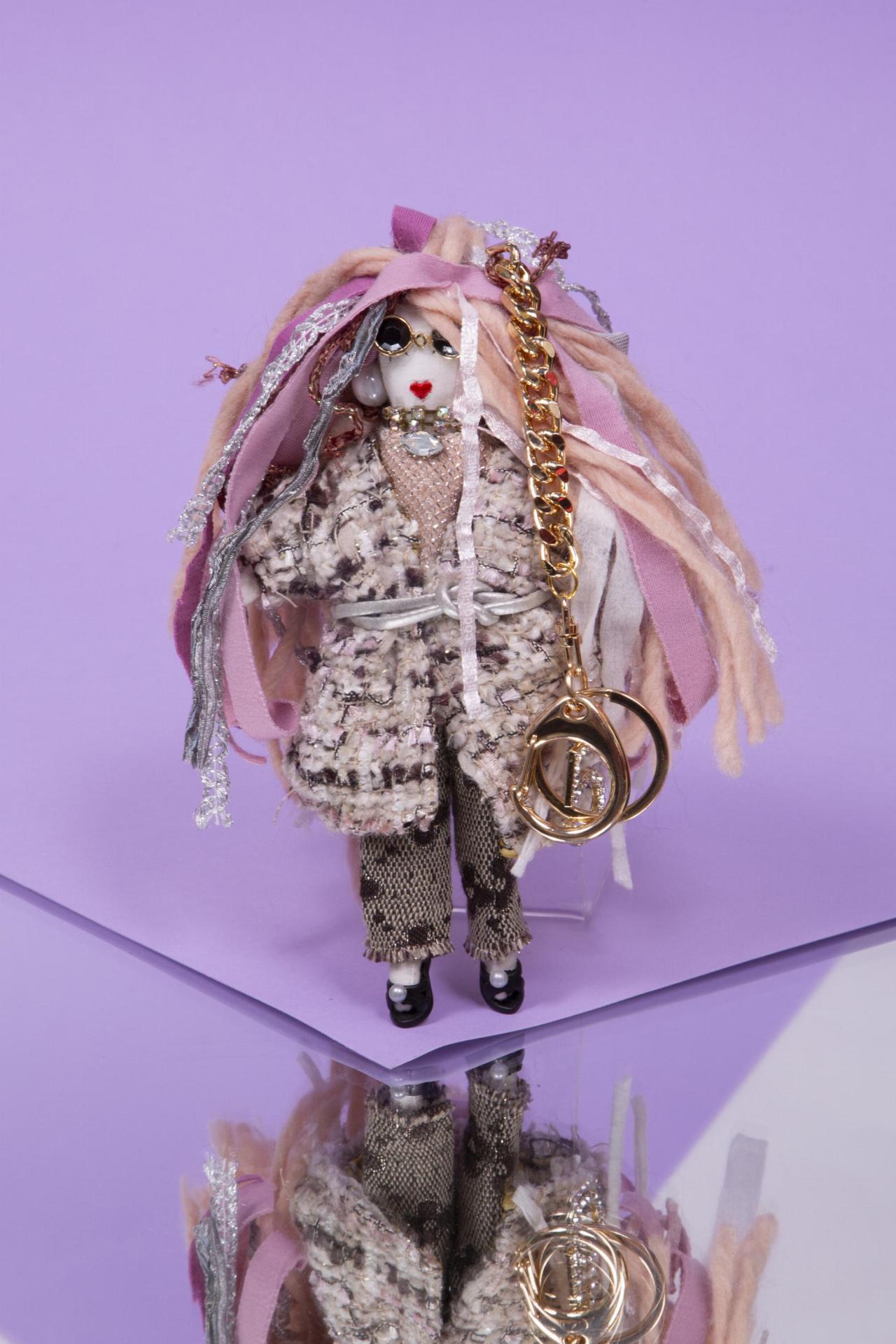 A hand-crafted Comely doll key holder featuring soft pastel yarn hair, a textured tweed coat, delicate beads, and gold chain details. A refined, feminine collectible full of gentle charm.