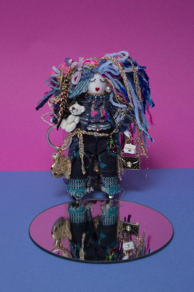 A fully hand-crafted Dorine doll key holder bursting with couture details, layered yarn hair, textured denim, gold accents, tiny charms, and a mini plush friend. A unique, collectible accessory full of whimsical personality.