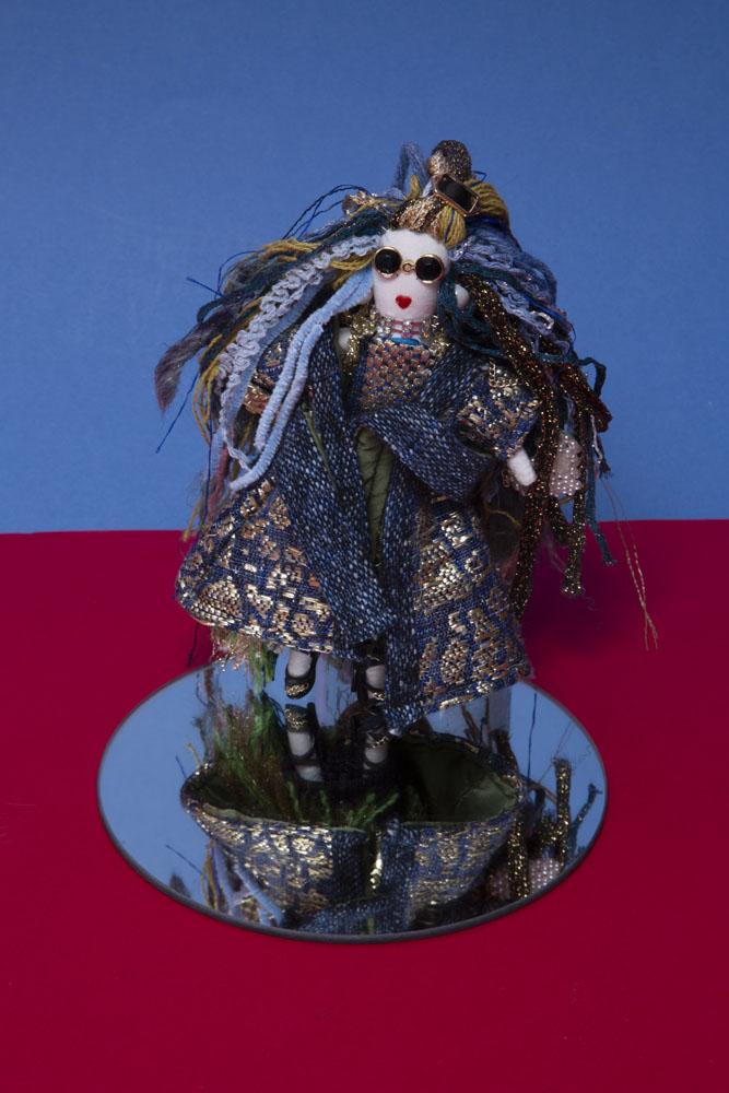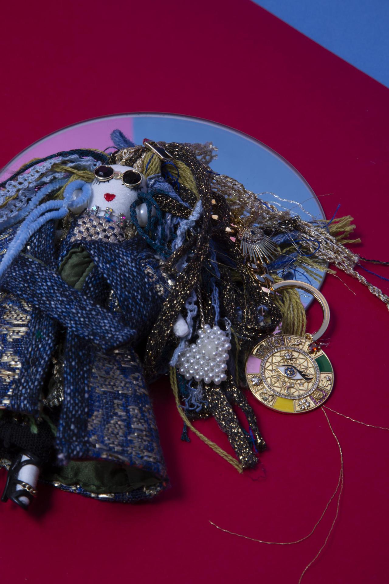 A hand-crafted Katell doll key holder dressed in rich blue-gold fabrics, textured yarn hair, bold sunglasses, and intricate layered details. A stylish, artistic collectible with a luxe, avant-garde feel.