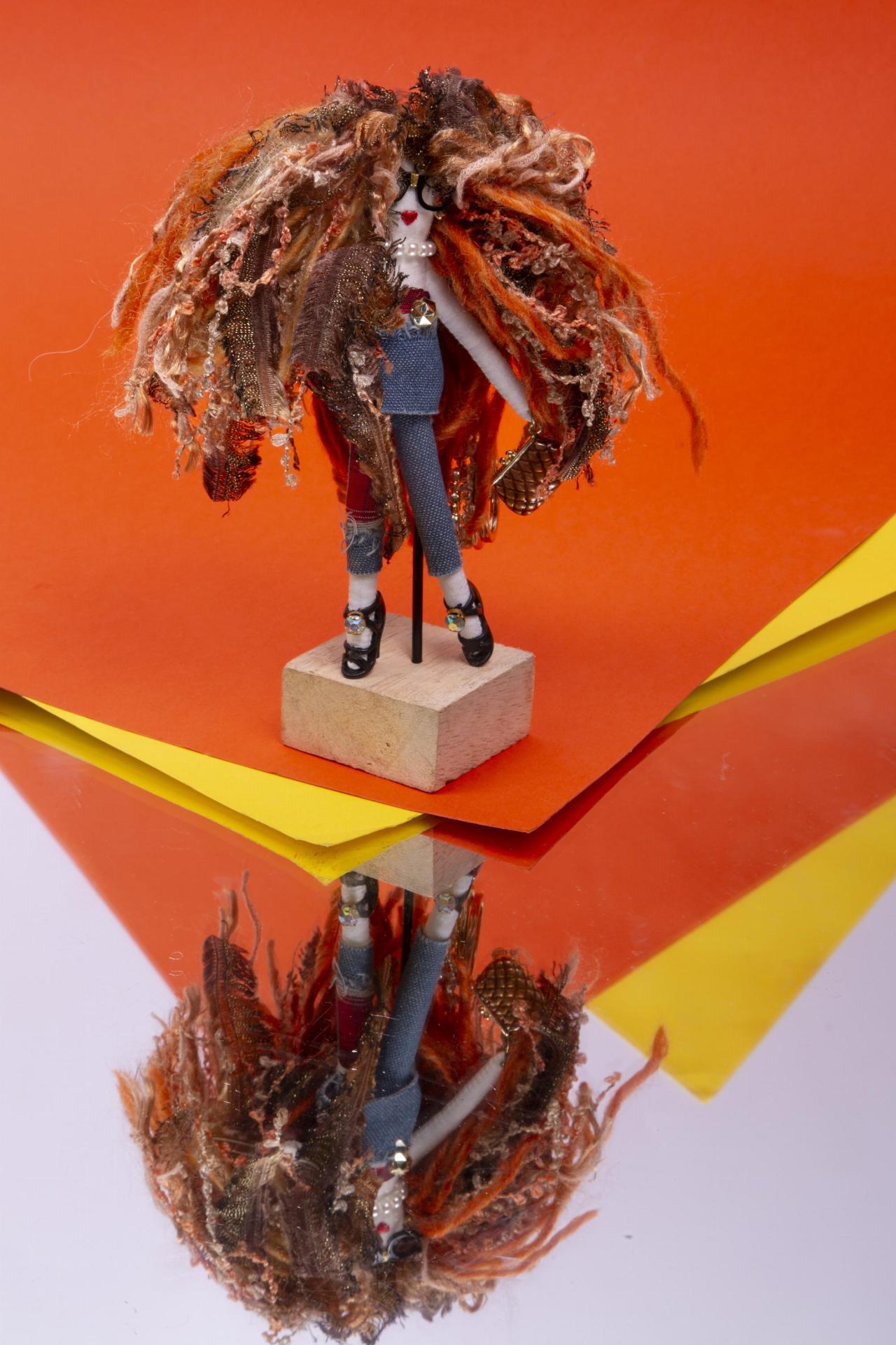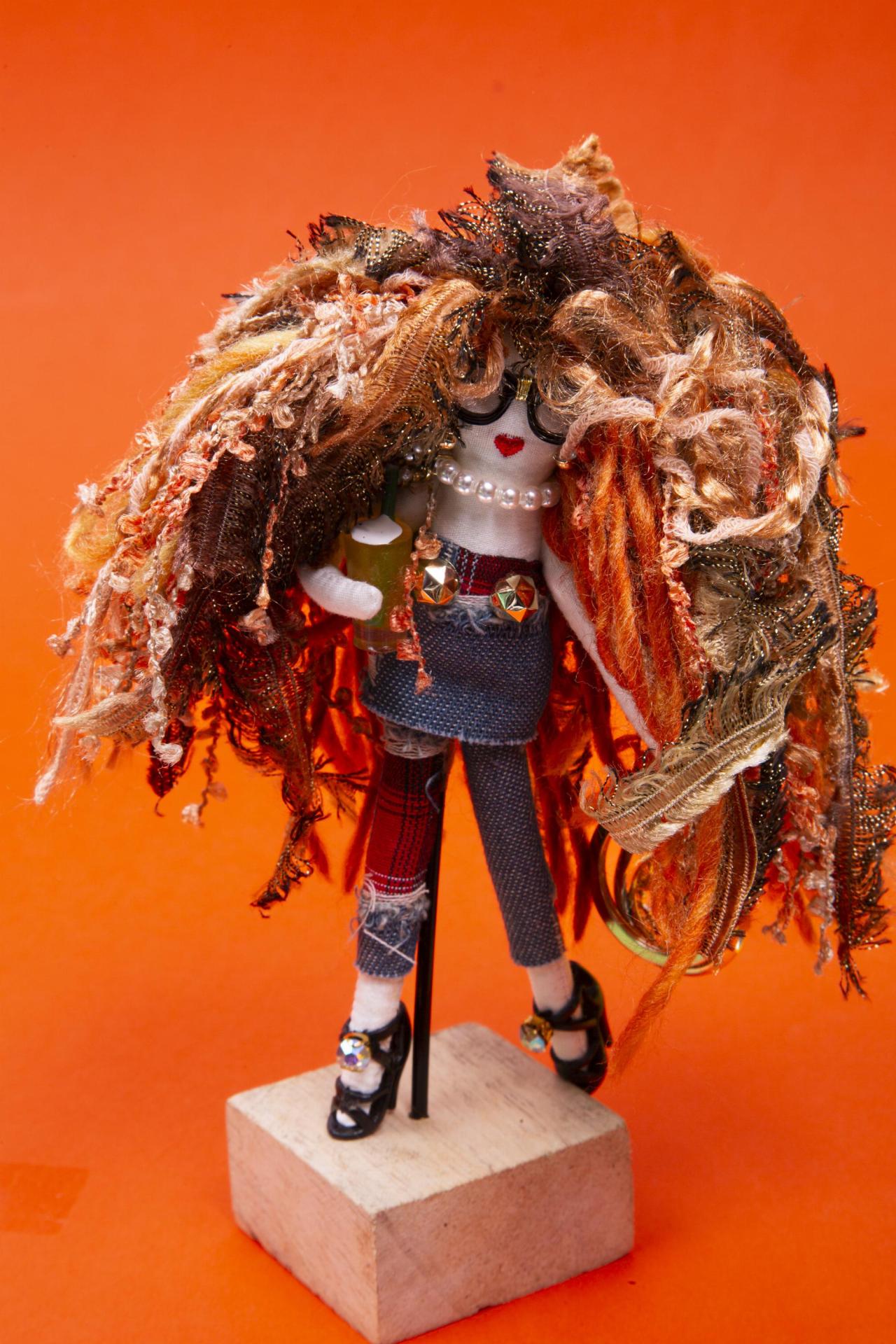 A hand-crafted Luna doll key holder with voluminous earth-tone yarn hair, a denim mini outfit, pearl accents, and eclectic textured details. A bold, artistic collectible full of character and warmth.