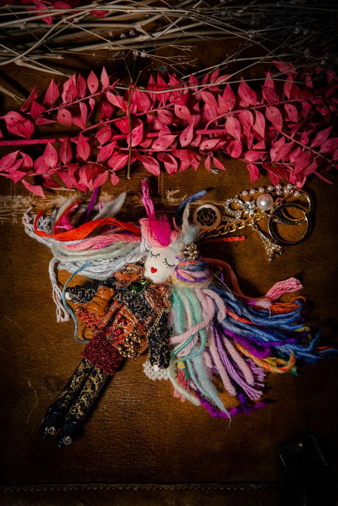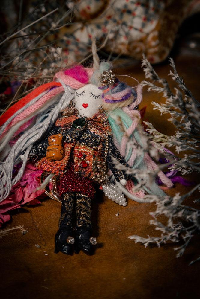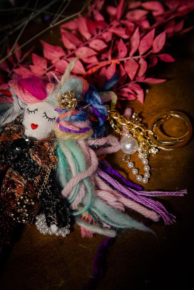A hand-crafted Marinette doll key holder with vibrant rainbow yarn hair, an intricately embellished outfit, sparkling beads, and rich textures. A bold, artistic collectible full of personality.