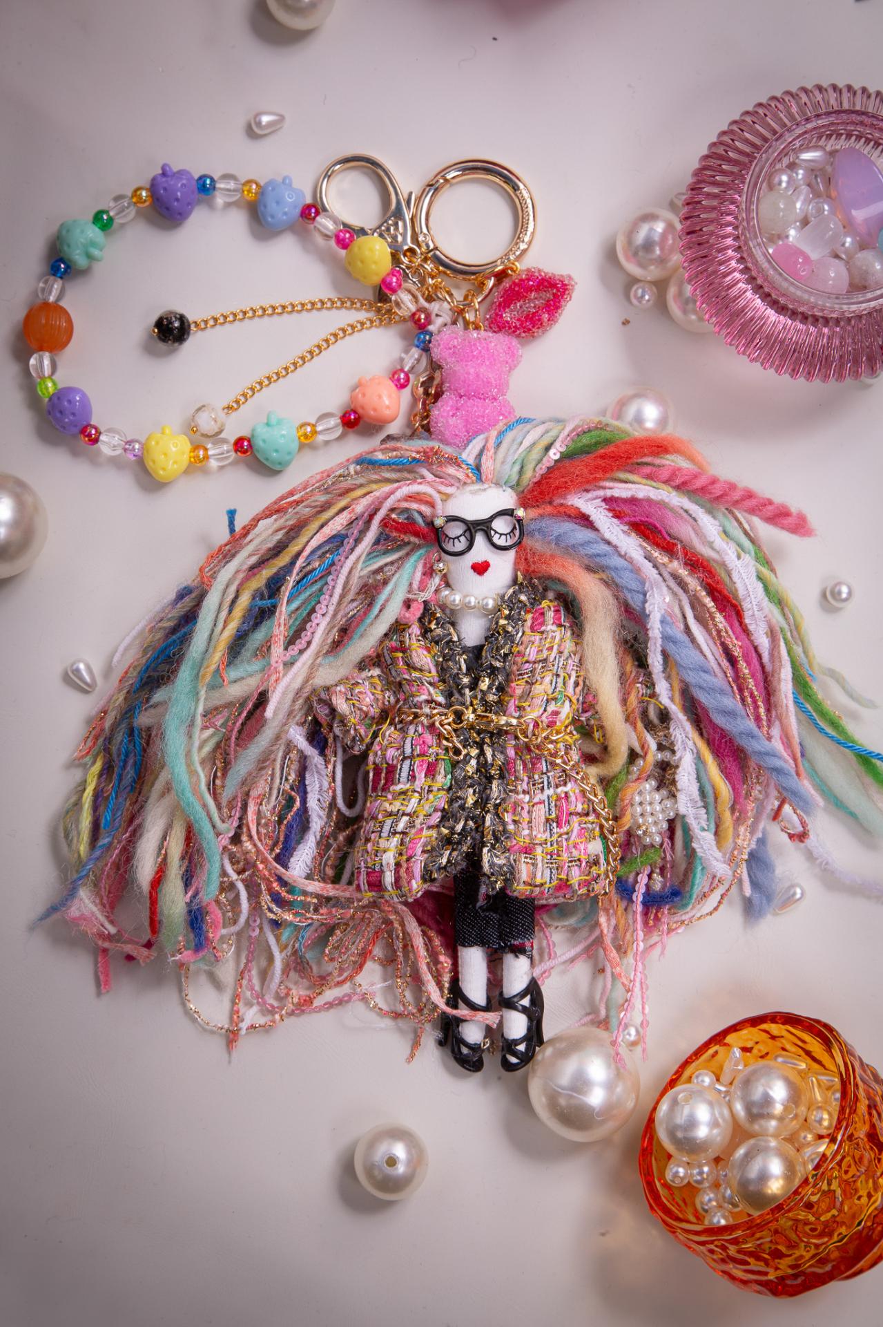 A hand-crafted Chloé doll key holder dressed in a chic textured coat, rainbow yarn hair, glasses, and sparkling details. A stylish, collectible accessory full of personality and charm.
