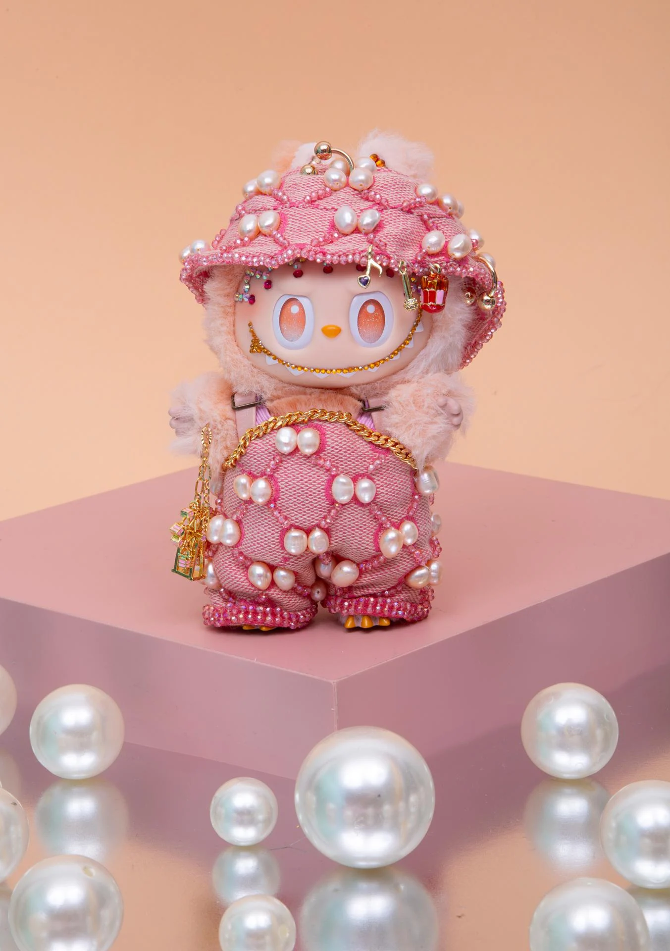 The Bubblegum Chic Labubu, Soft Pink Edition is a dreamy fusion of plush textures and playful craftsmanship. Wrapped in a fluffy cream hood and wearing an adorable pink bucket hat, this Labubu shines with an outfit covered in glossy beads, sparkling accents, and soft pastel tones.