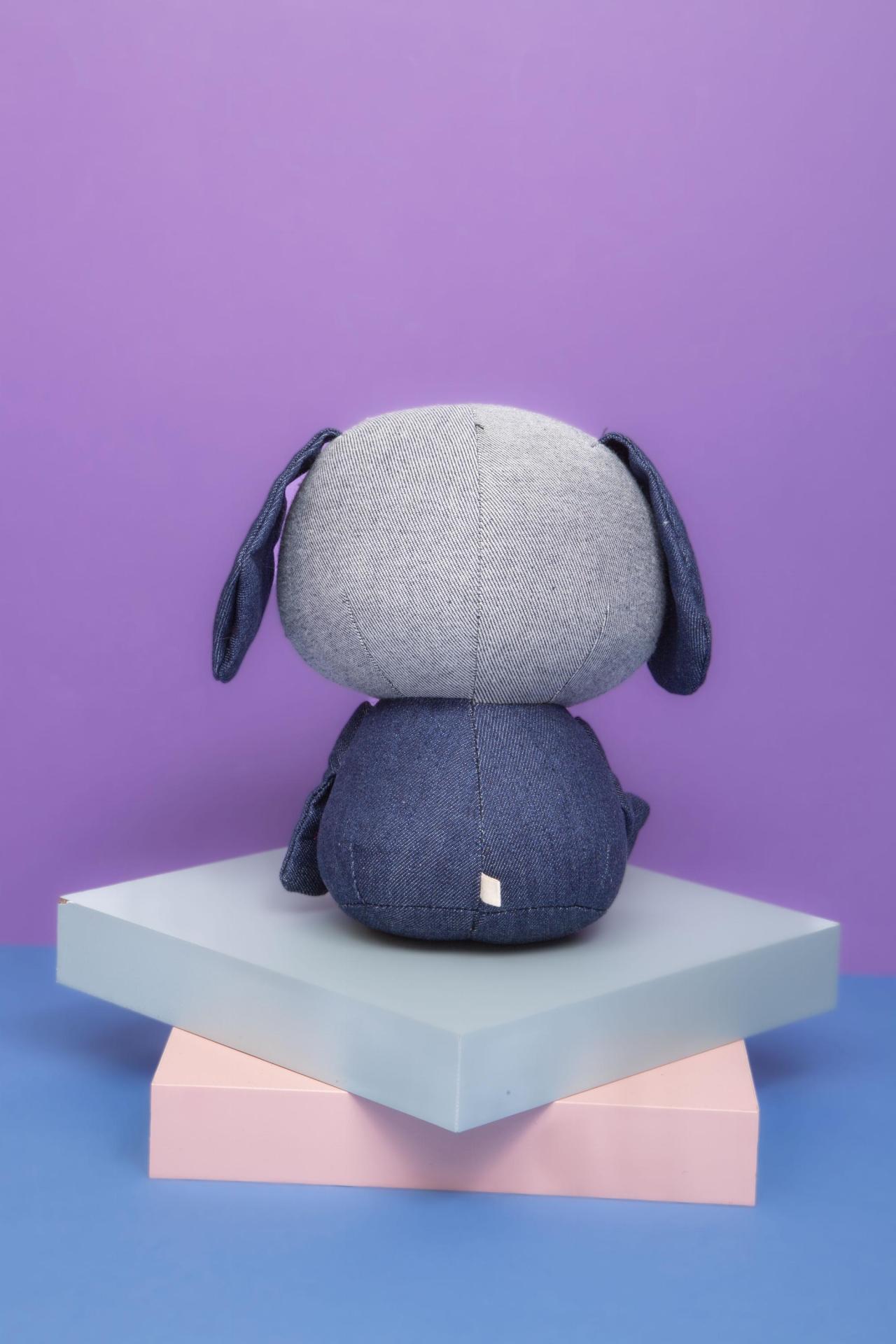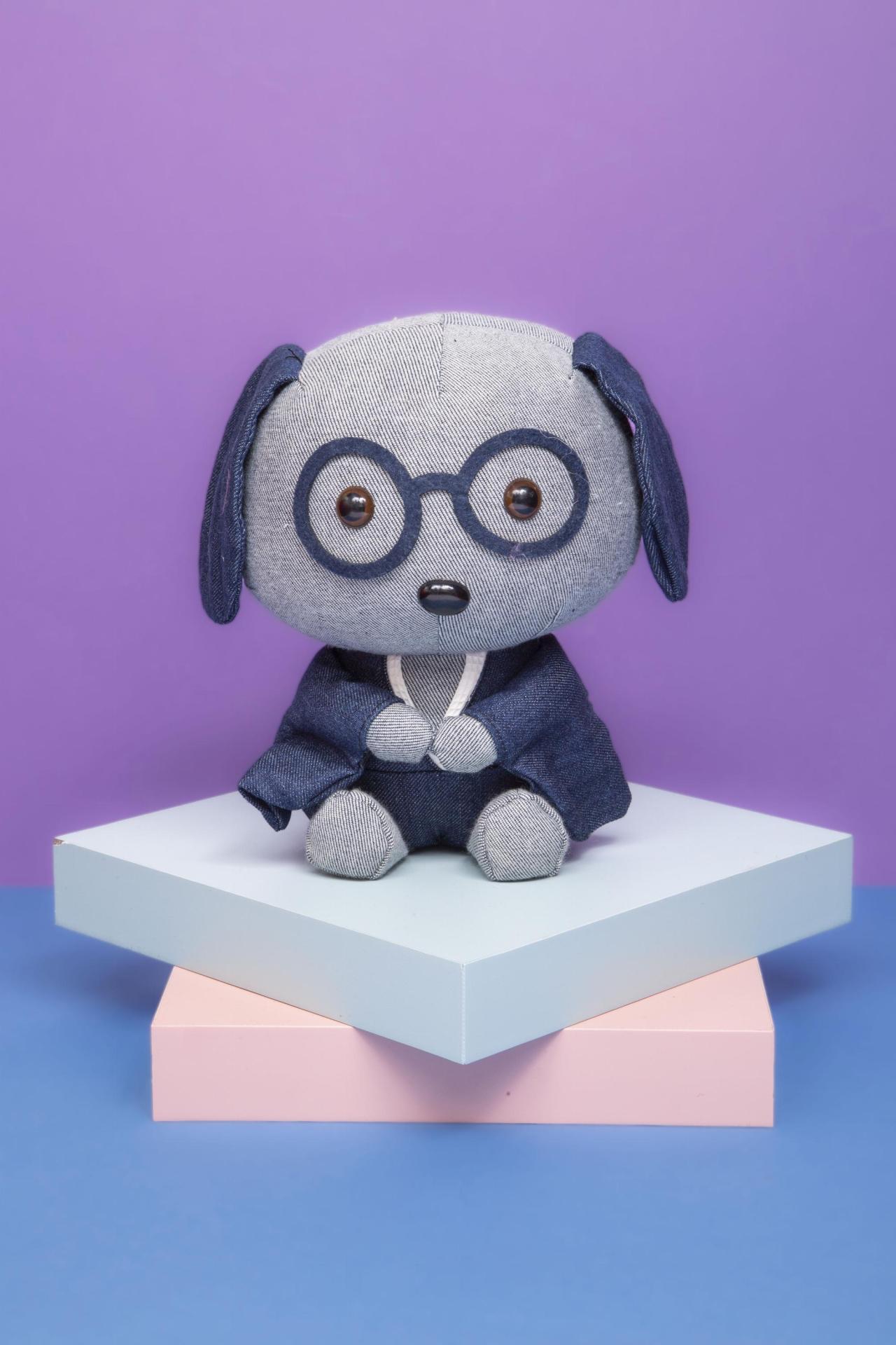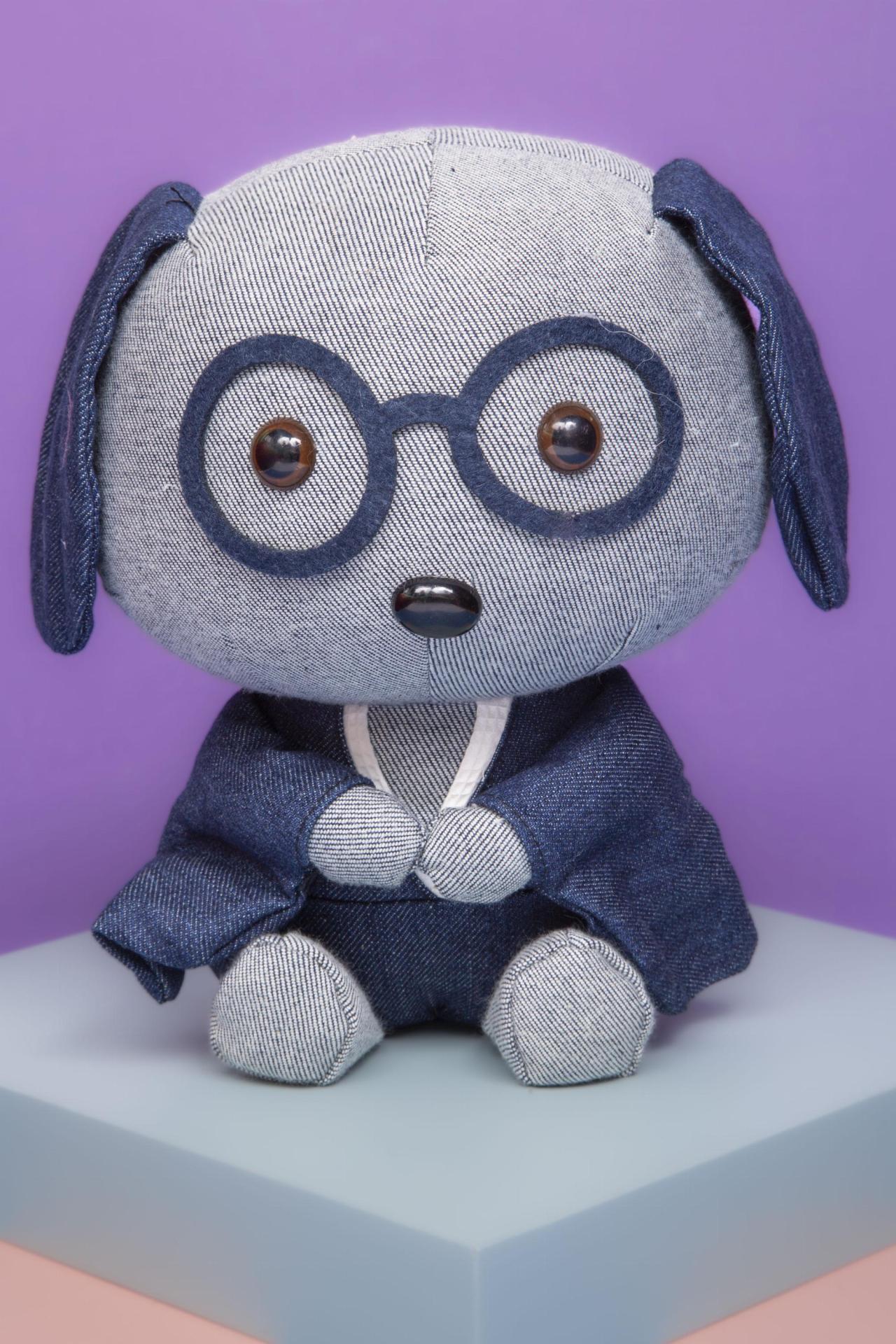 A charming Lady Dog plush designed in denim-style fabric, featuring oversized round glasses and a cute little coat. Soft, stylish, and full of personality.