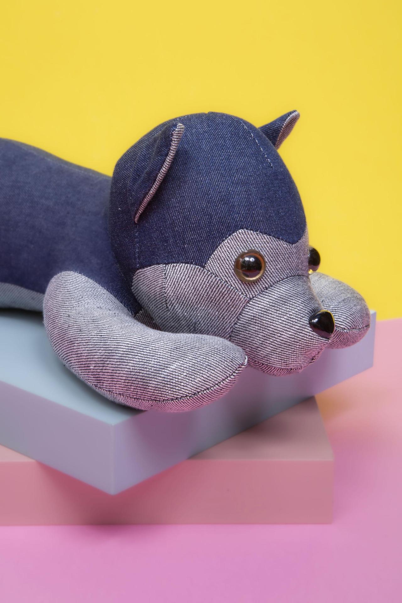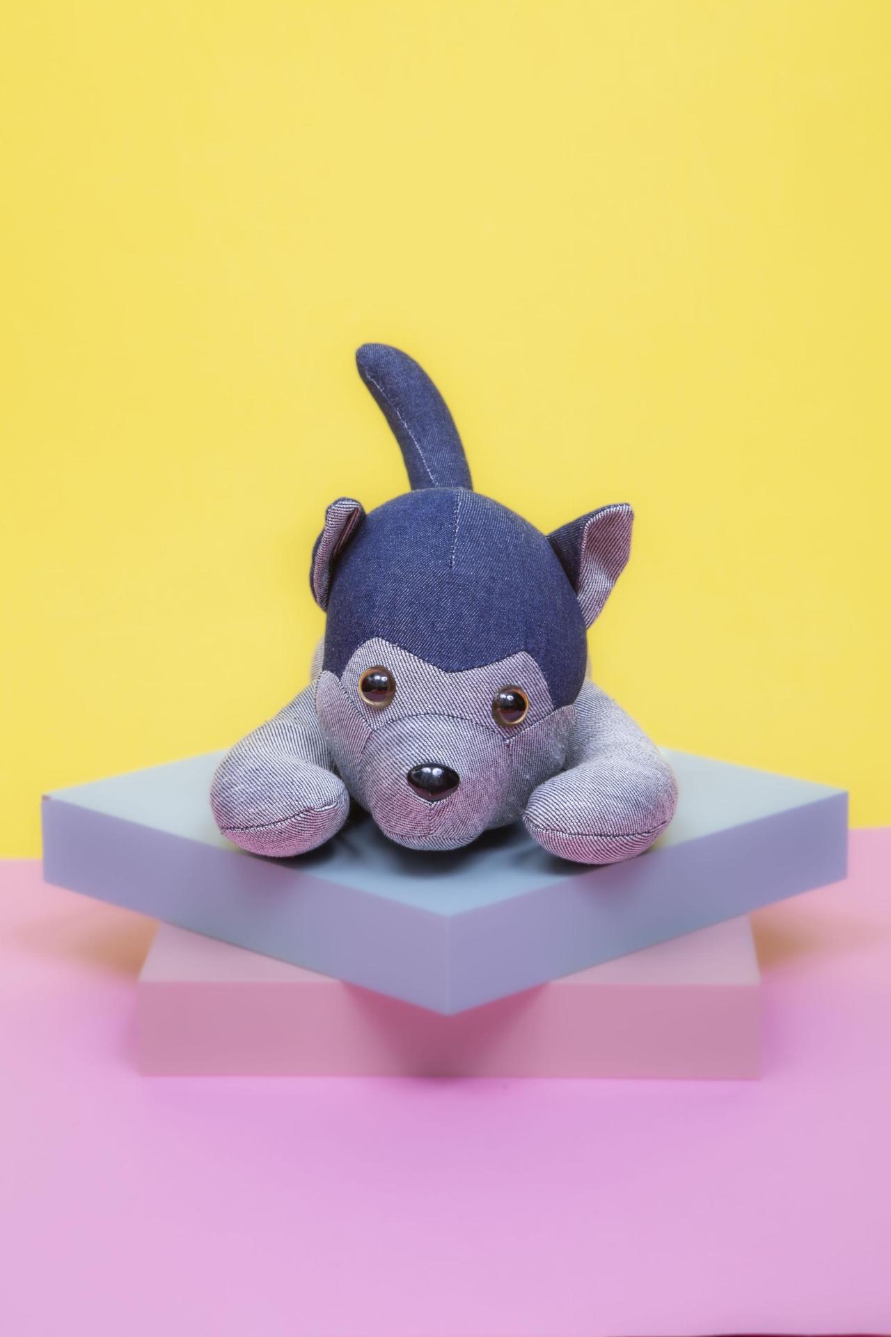 A soft Little Dog plush with a denim-style body, floppy ears, and an endearing lying-down pose. Cute, gentle, and perfect for snuggles.