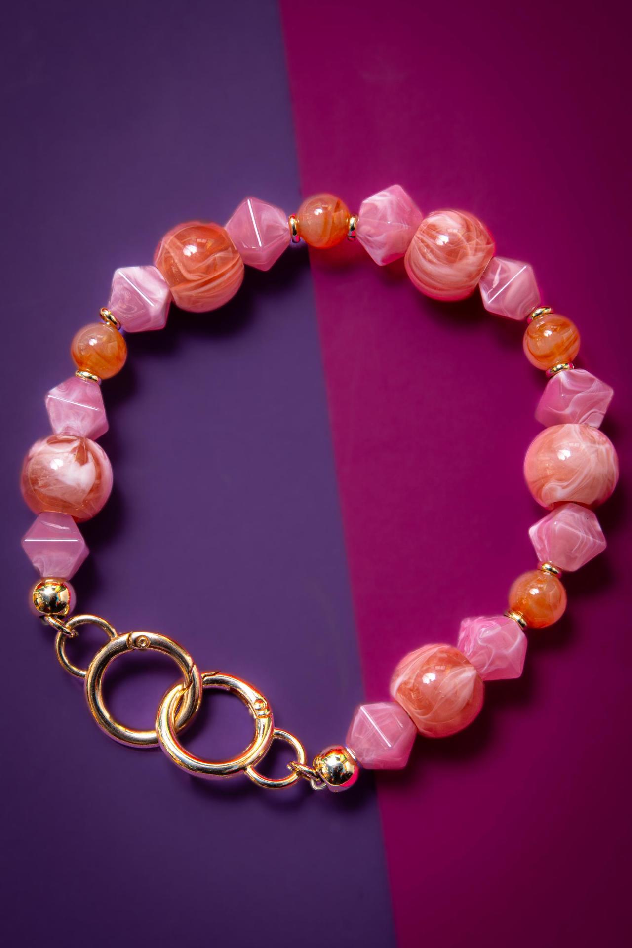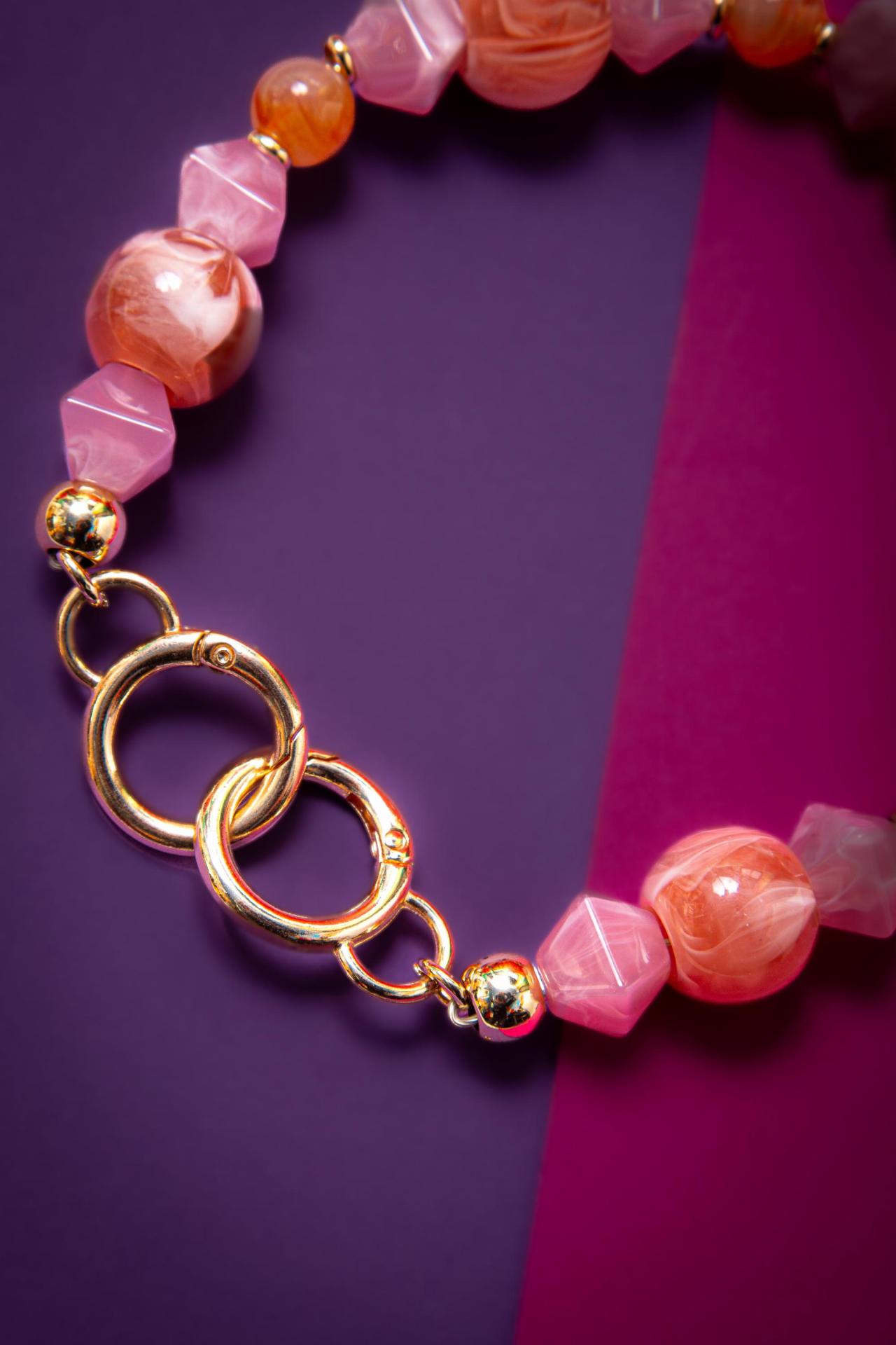Une chaîne de téléphone ornée de perles pêche et roses marbrées avec des anneaux dorés pour une touche douce et colorée.