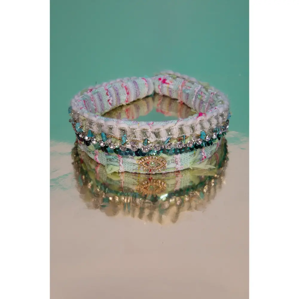 Un serre-tête en tweed pastel décoré de cristaux scintillants et de perles bleues pour une allure douce et lumineuse.