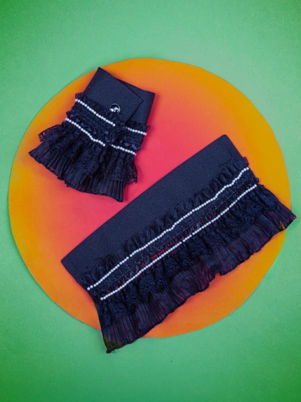 Un poignet en tissu marine décoré de volants superposés et d’une fine bordure...