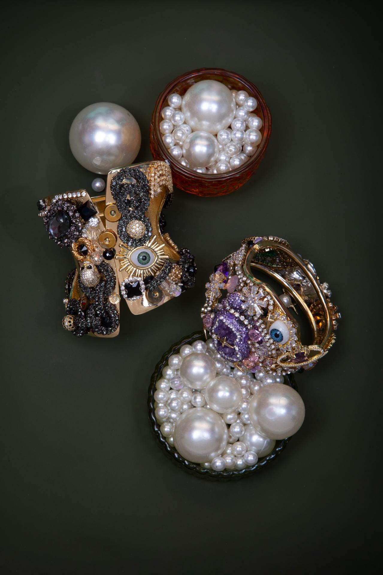 Une broche dorée en forme de cœur décorée de cristaux, perles et pierres...