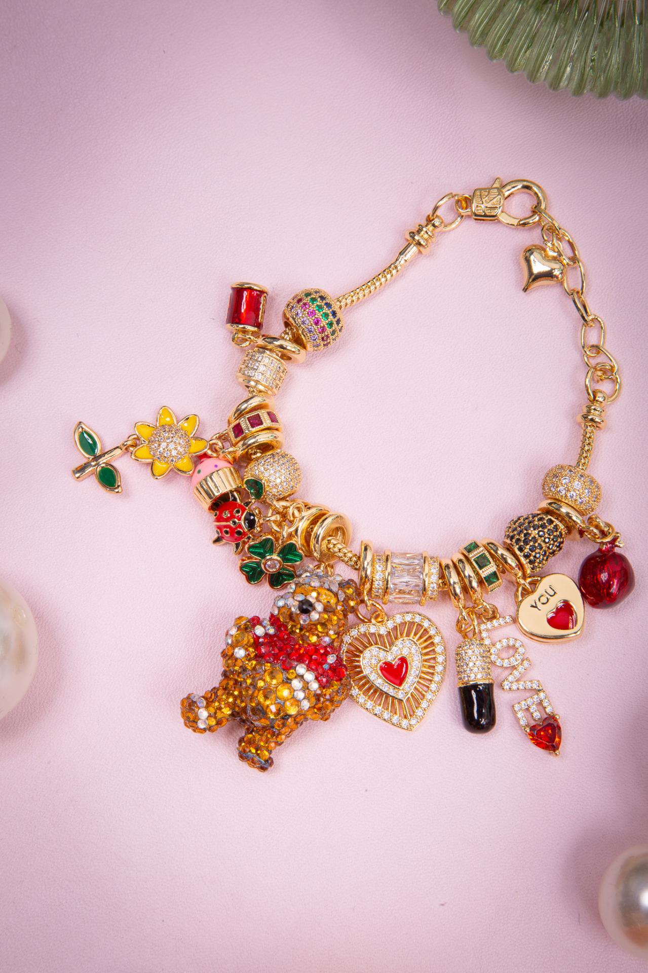 Au centre brille un charm ourson serti de cristaux dans des tons ambre, rubis et blanc, entouré de charms expressifs : pavé “LOVE”, cœurs en émail, rouge à lèvres et parfum dorés, tournesol jaune et vert, coccinelle, trèfle, ainsi que des accents en verre rouge. Des perles cristallines taillées et des éléments perlés ajoutent mouvement, brillance et texture.