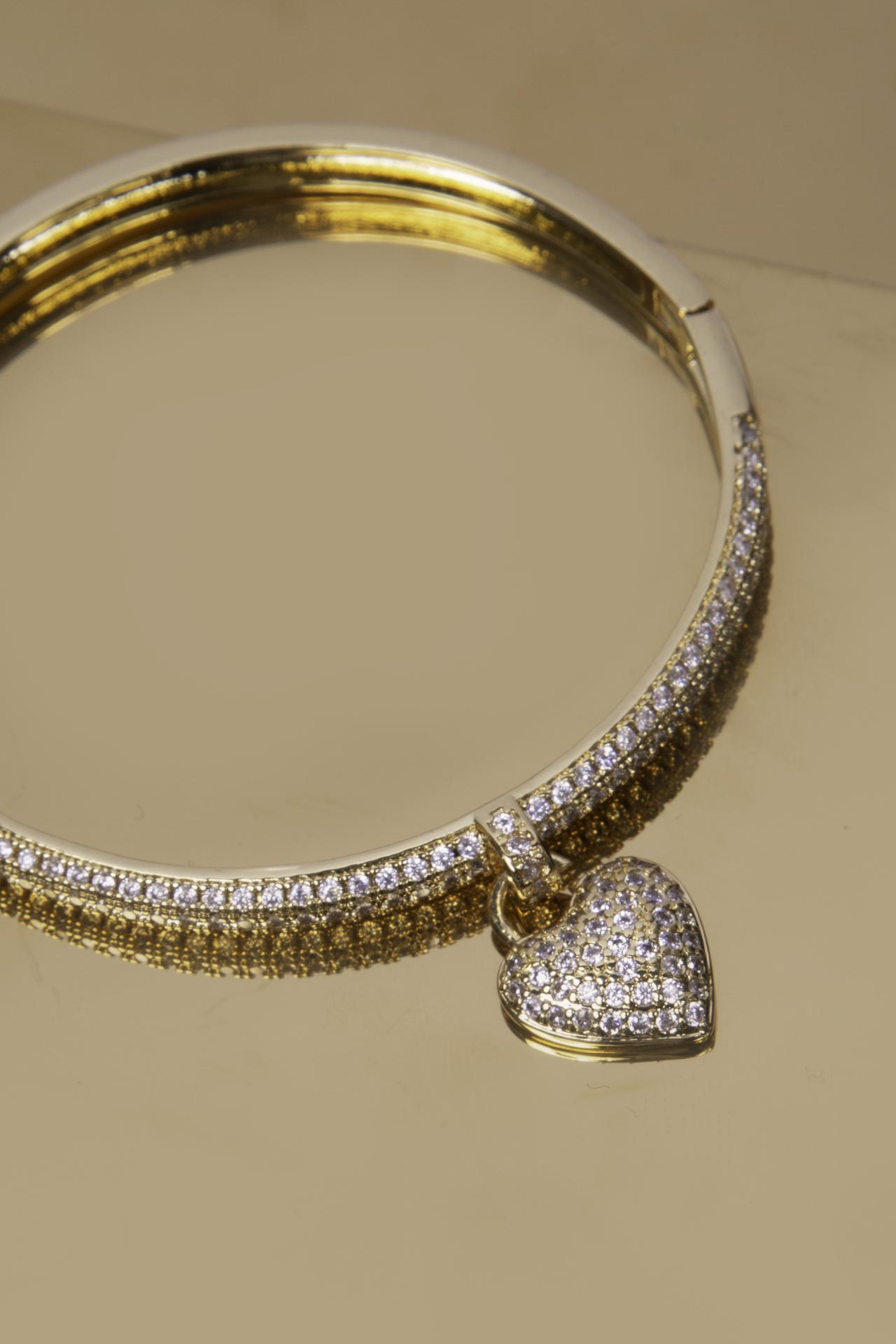 Pièce raffinée et romantique, ce bracelet présente un jonc doré entièrement serti de micro-cristaux pavés pour un éclat continu et lumineux. Au centre, un charm cœur assorti recouvert de cristaux capte la lumière à chaque mouvement, ajoutant une touche d’élégance ludique.
