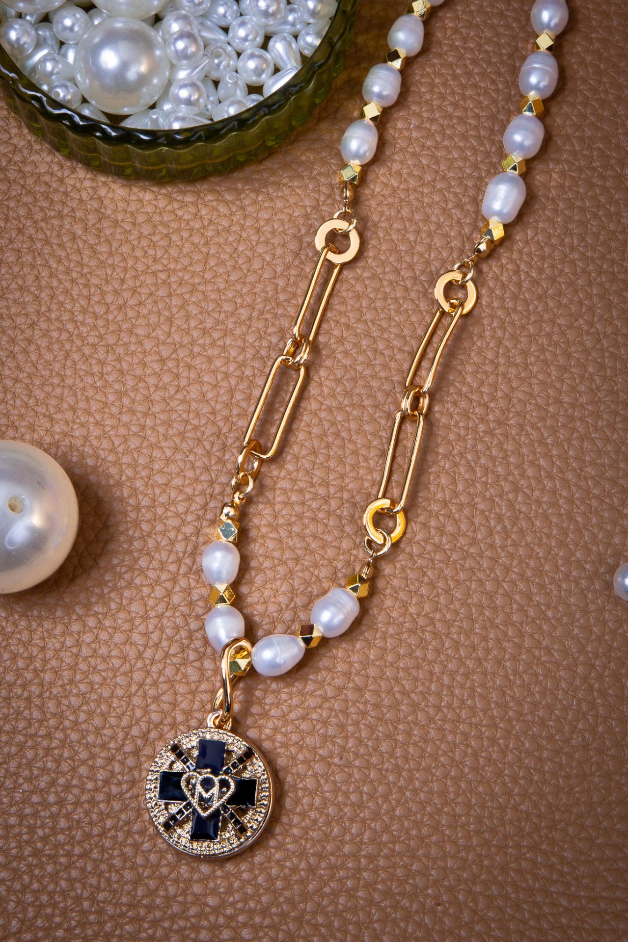 Un collier en acier inoxydable émaillé mêlant perles baroques chaîne dorée et médaillon noir.
