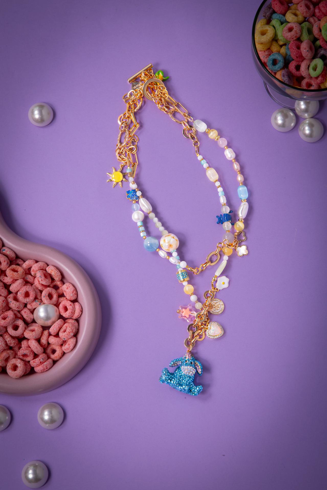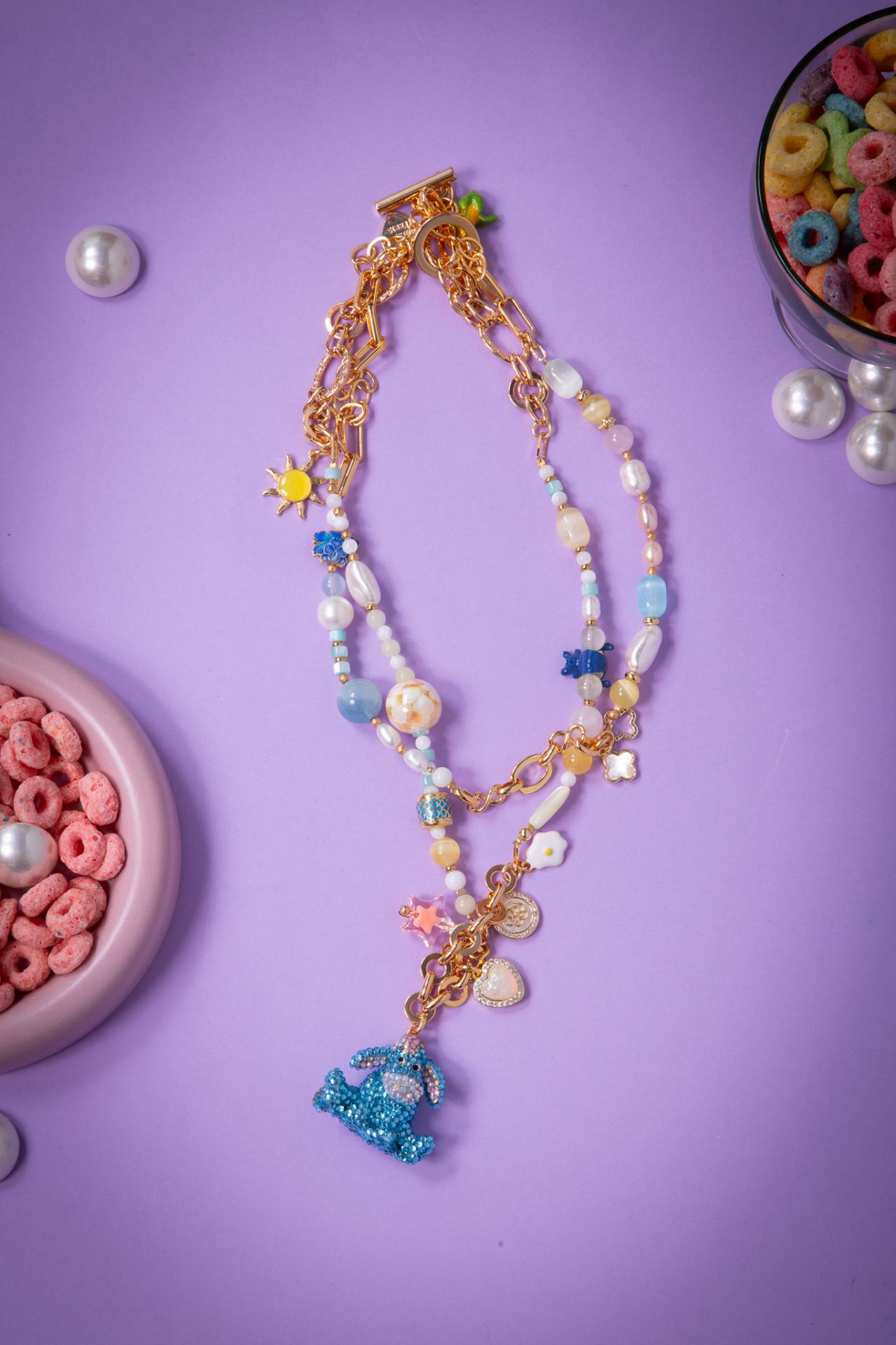Un collier en acier inoxydable mêlant perles pastels pierres naturelles chaînes dorées et charms fantaisie sublimé par un pendentif âne bleu scintillant confectionné à partir de matériaux upcyclés et recyclés.