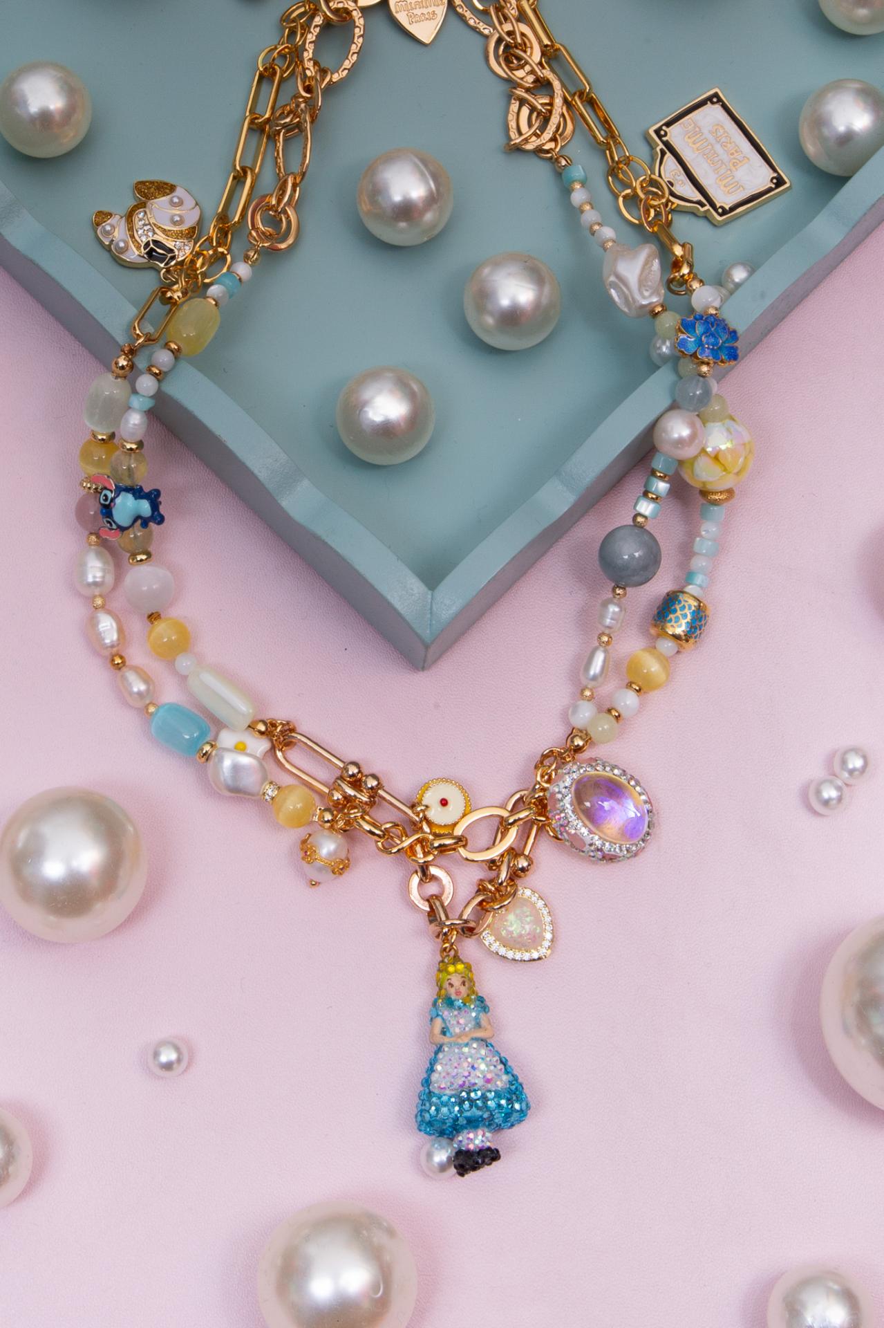 Un collier en acier inoxydable orné de pierres naturelles de perles de perles pastel et d’un pendentif personnage étincelant inspiré des contes.