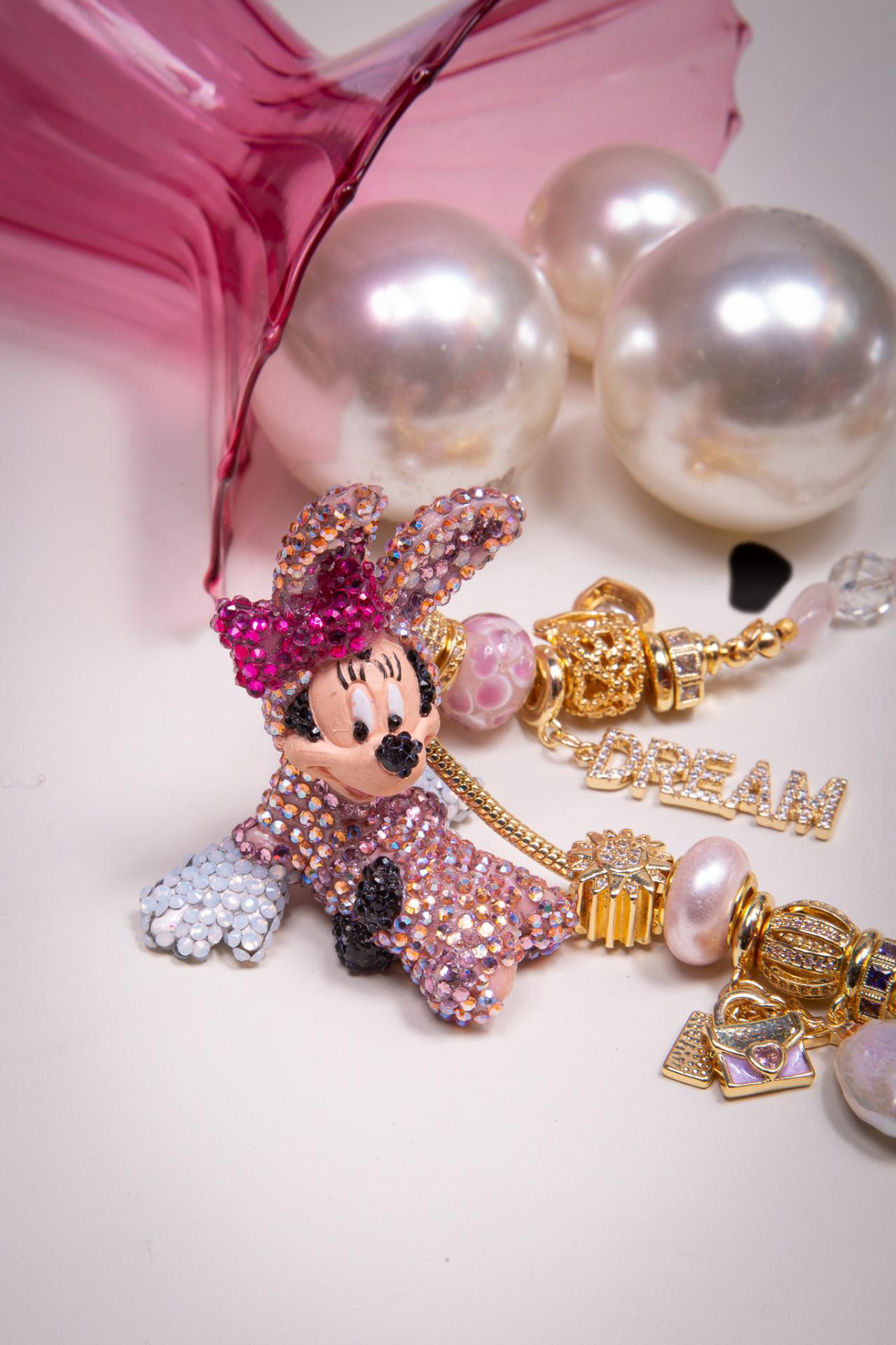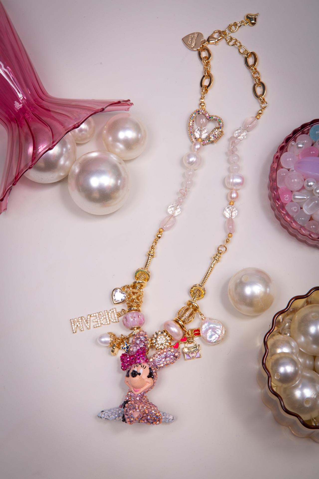 Un collier en acier inoxydable émaillé avec perles pierres et charms variés, terminé par un pendentif souris cristallisée en rose.