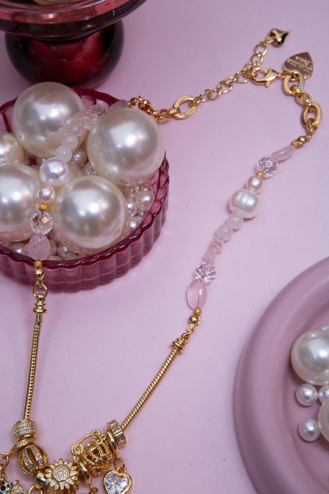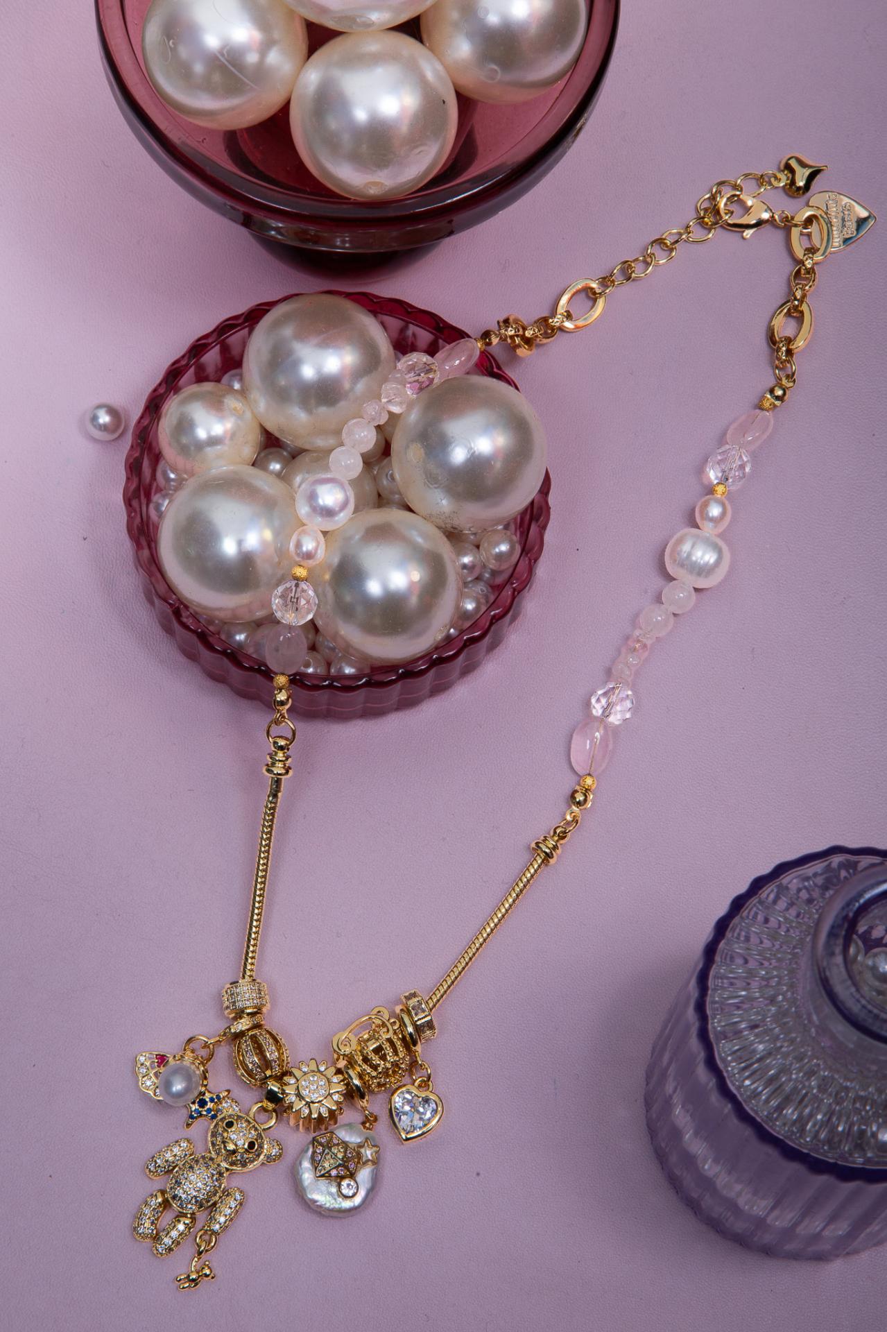 Un collier en acier inoxydable émaillé avec perles pierres et charms dorés, orné d’un pendentif ourson scintillant.