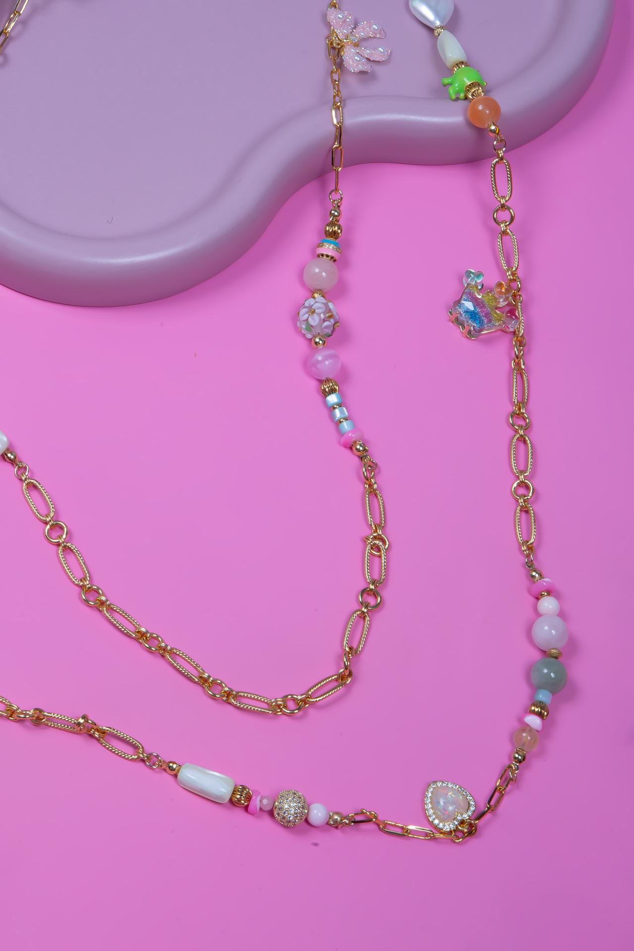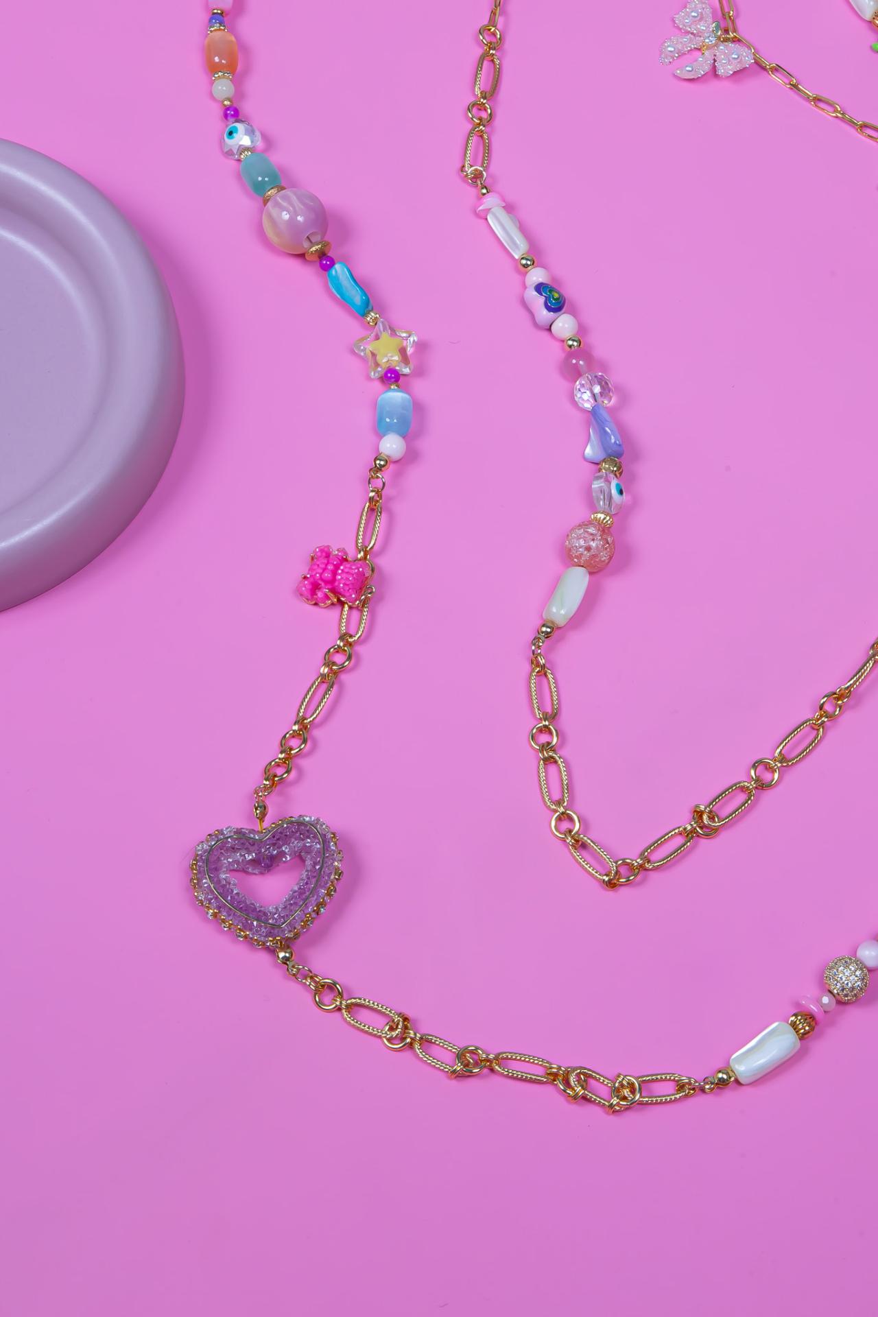 Un collier en acier inoxydable orné de pierres naturelles de perles de charms pastel et d’un pendentif cœur lavande scintillant.