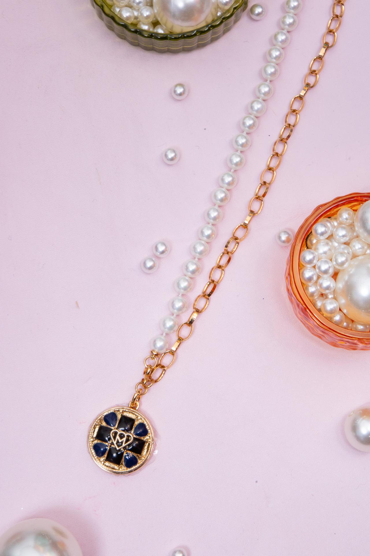 Un collier en acier inoxydable mêlant perles lumineuses chaîne dorée et médaillon bleu nuit, MiniMe Medallion révèle une élégance intemporelle un contraste moderne et un détail couture.