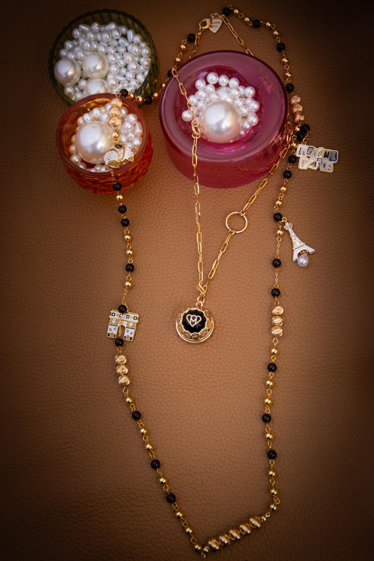 Un collier en acier inoxydable émaillé orné de pierres noires de perles d’éléments dorés et de charms parisiens, terminé par un médaillon noir MiniMe.