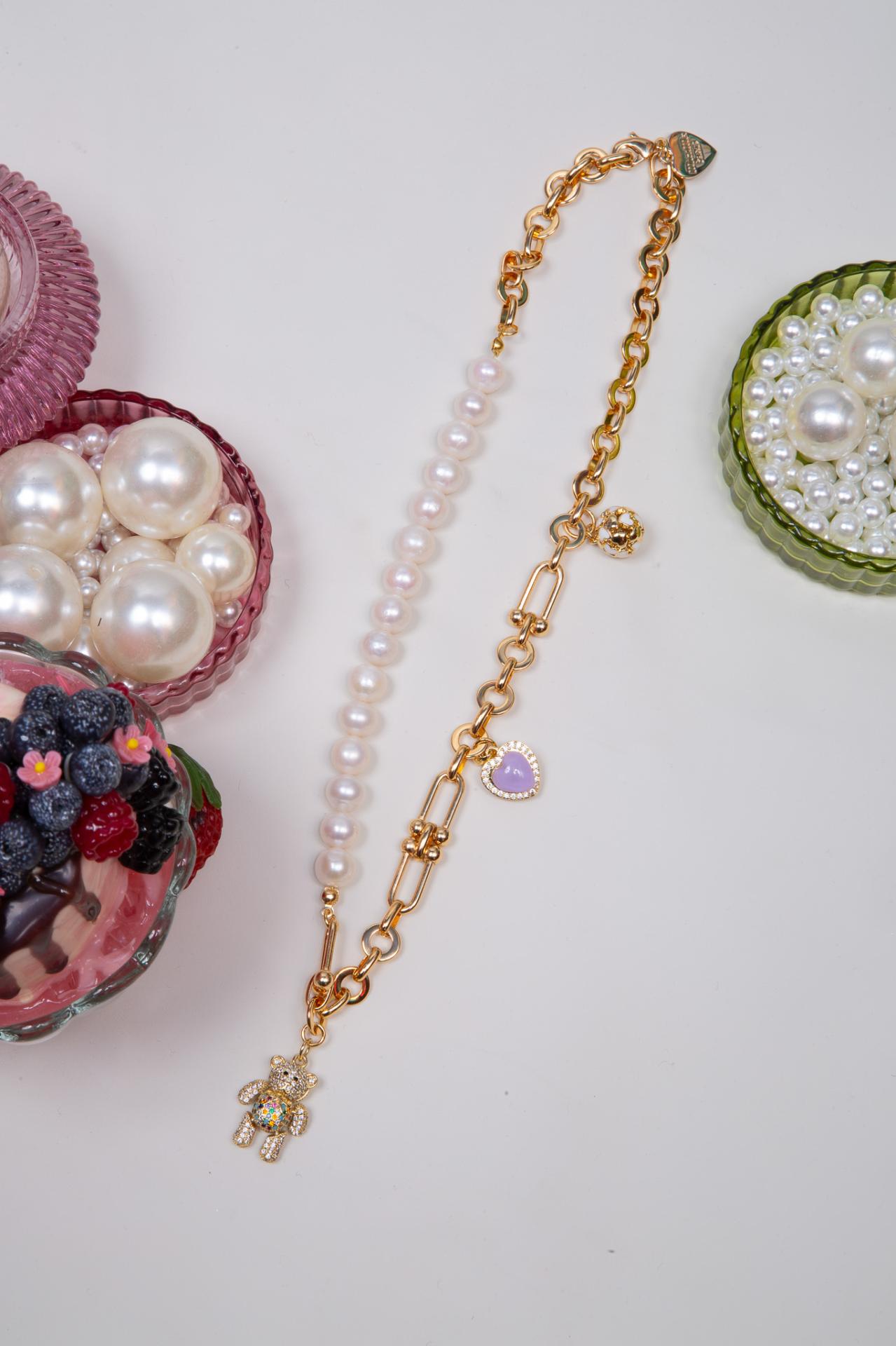Un collier en acier inoxydable composé de perles d’eau douce, de maillons dorés et d’un pendentif ourson scintillant.