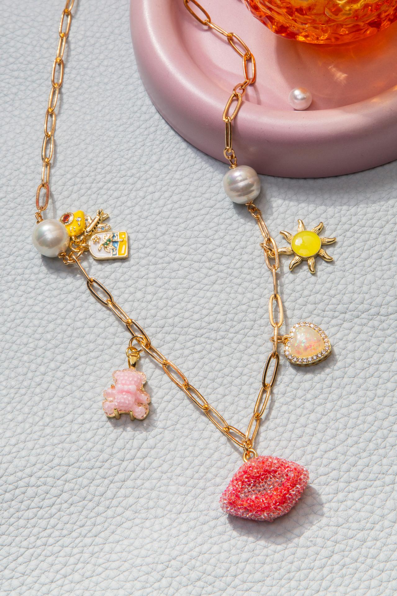 Un collier en acier inoxydable émaillé orné de pierres naturelles de perles et de charms fantaisie, mis en valeur par un pendentif lèvres rose scintillant.