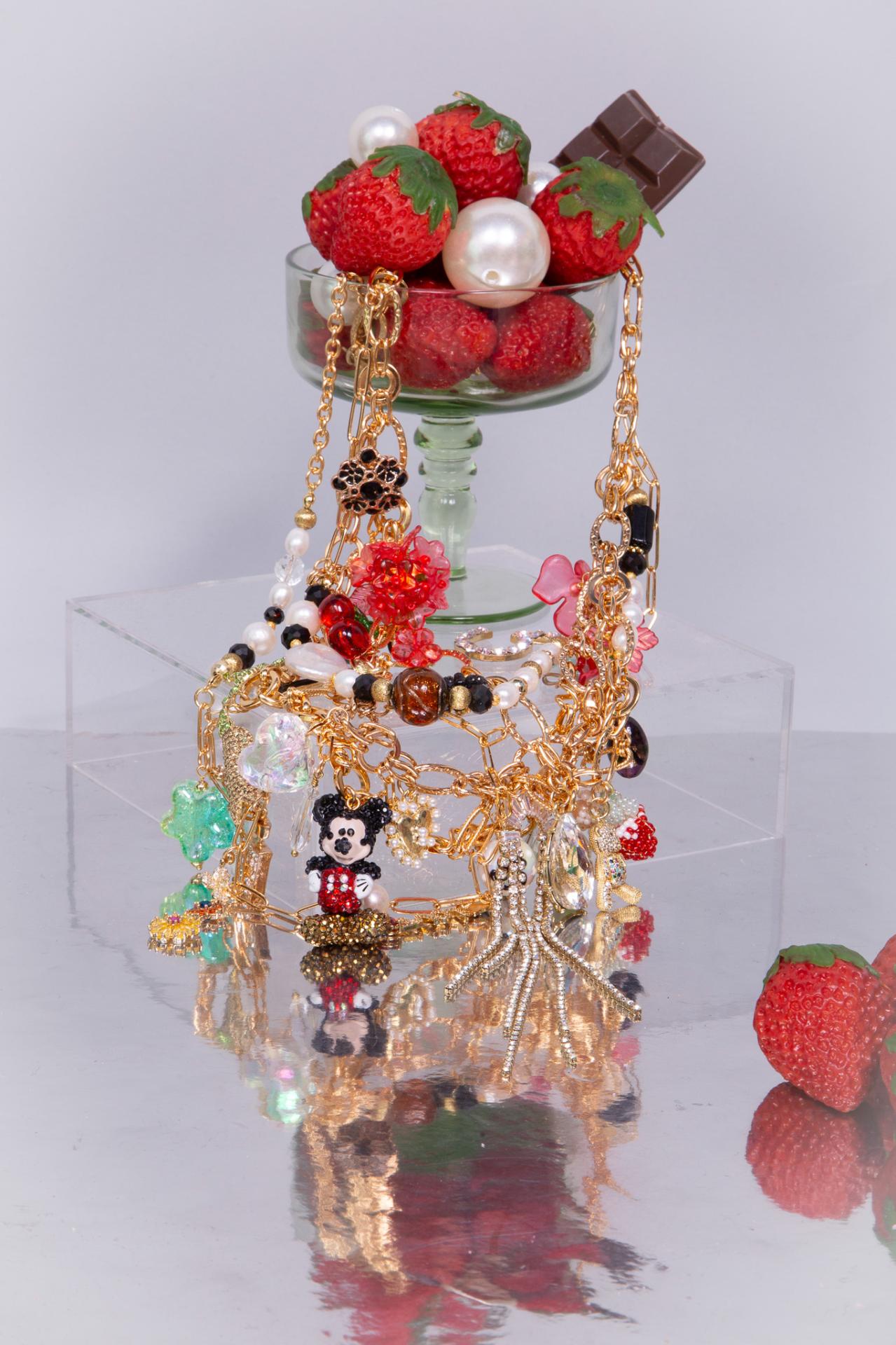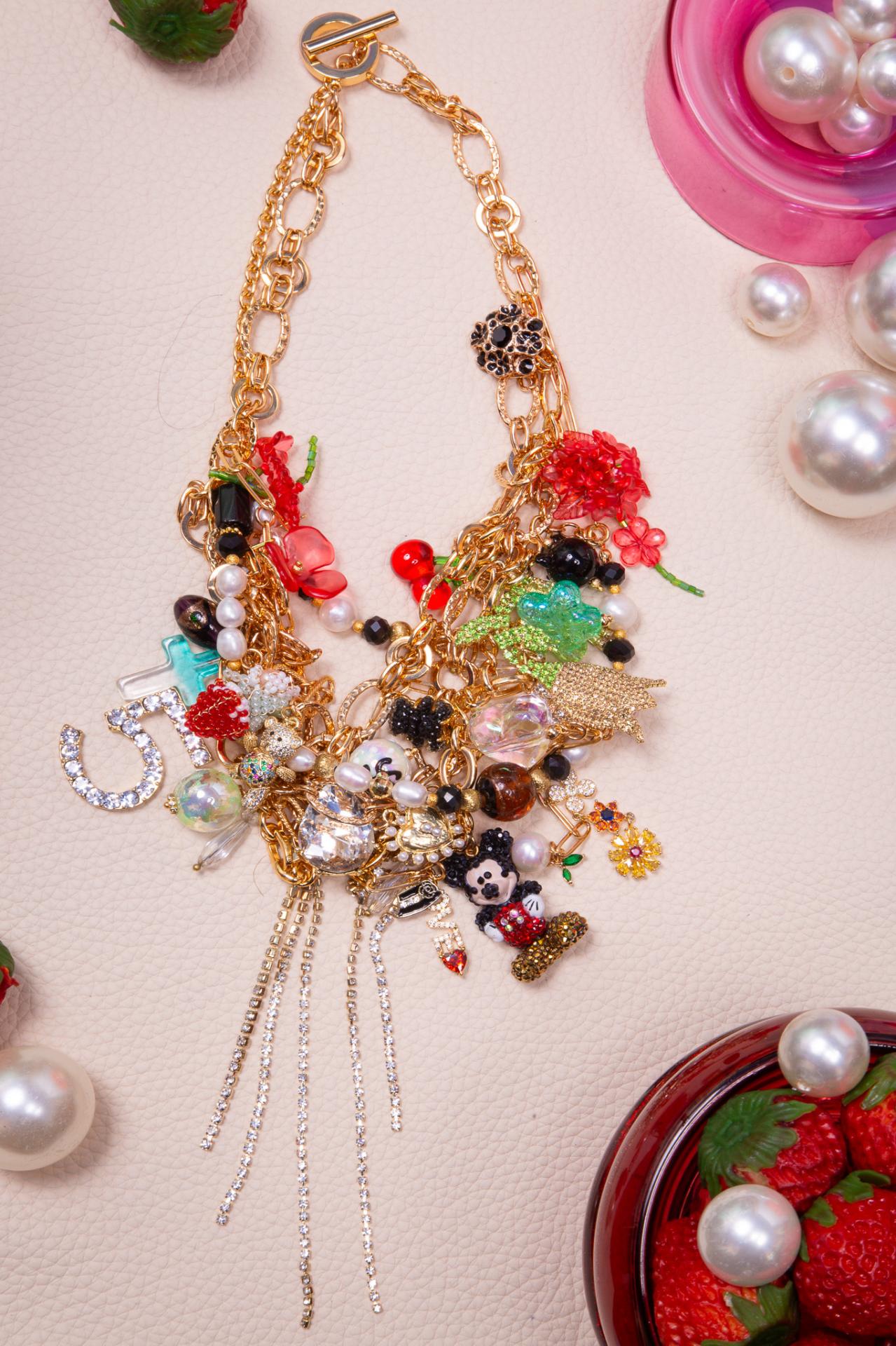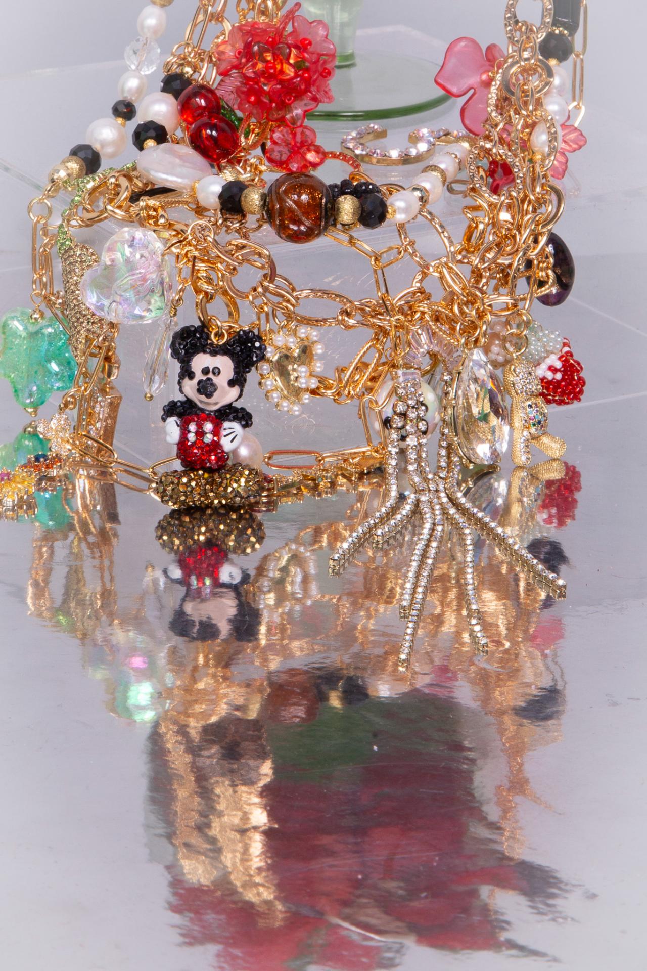 Un collier en acier inoxydable émaillé avec perles pierres et charms décoratifs, orné d’un pendentif souris scintillant.