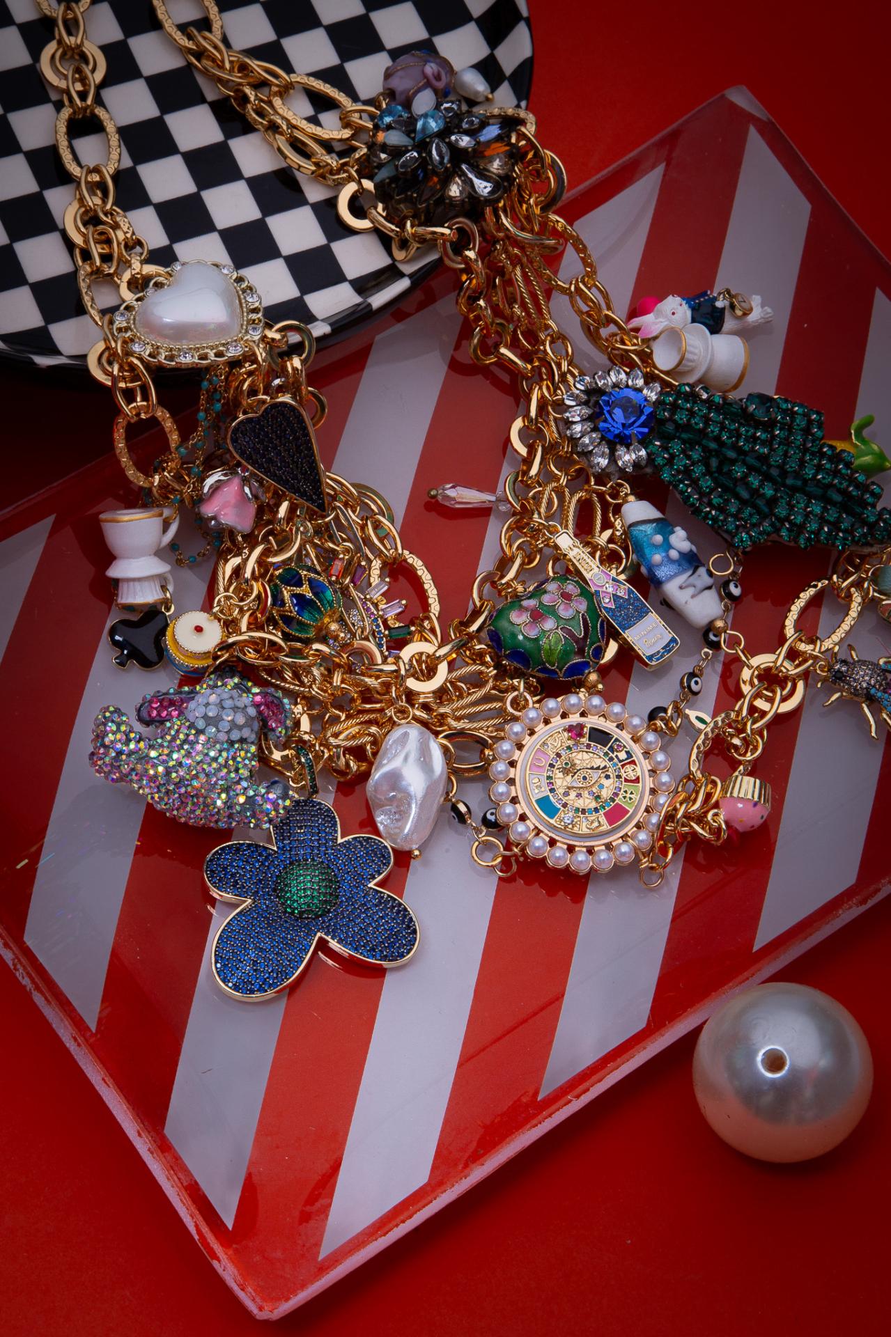 Un collier statement en acier inoxydable orné de pierres naturelles, de perles et d’un mélange éclectique de charms colorés.