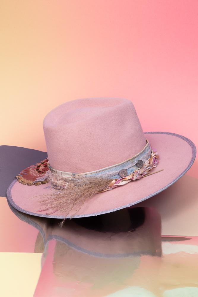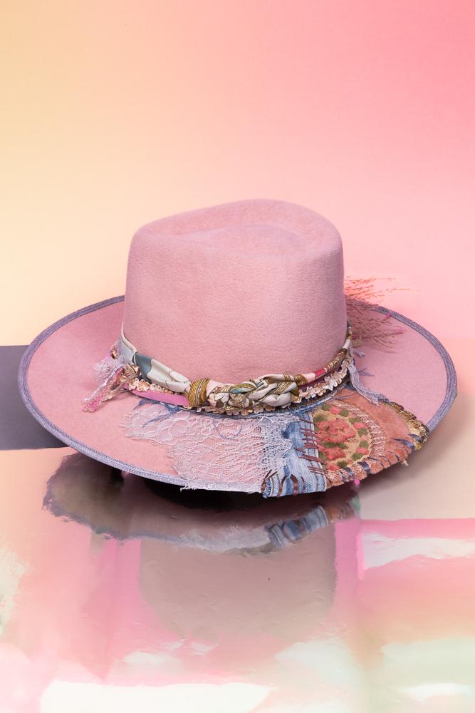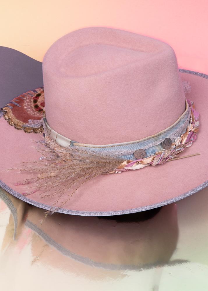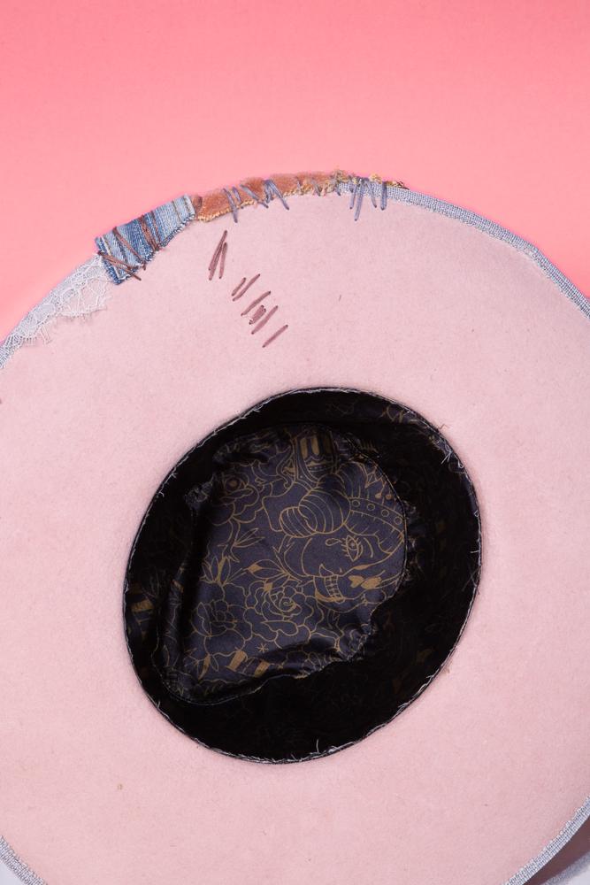 Chapeau Bohème Pastel Rose Fait Main avec Dentelle, Denim et Détails Floraux