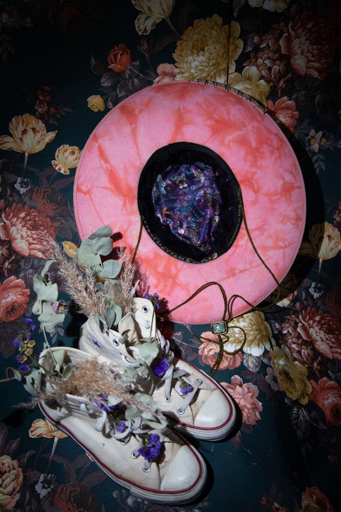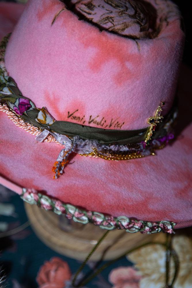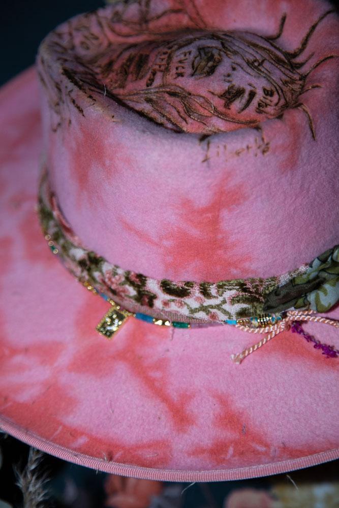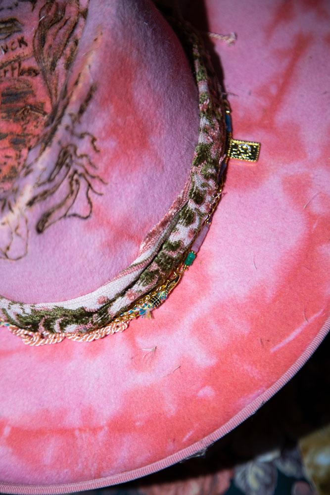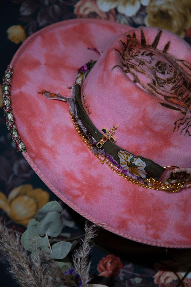 Chapeau Artisanal Rose , Textile Tie & Dye, Breloques Dorées et Détails Façonnés à la Main