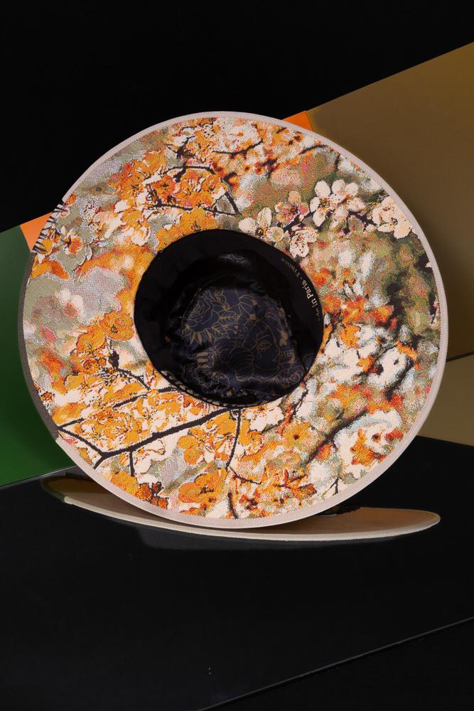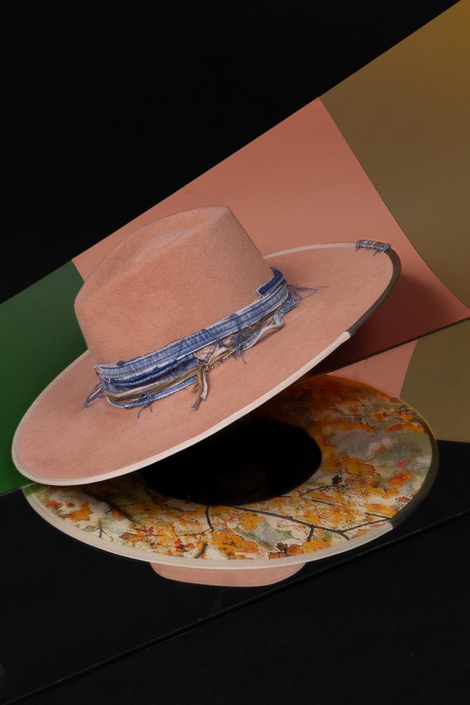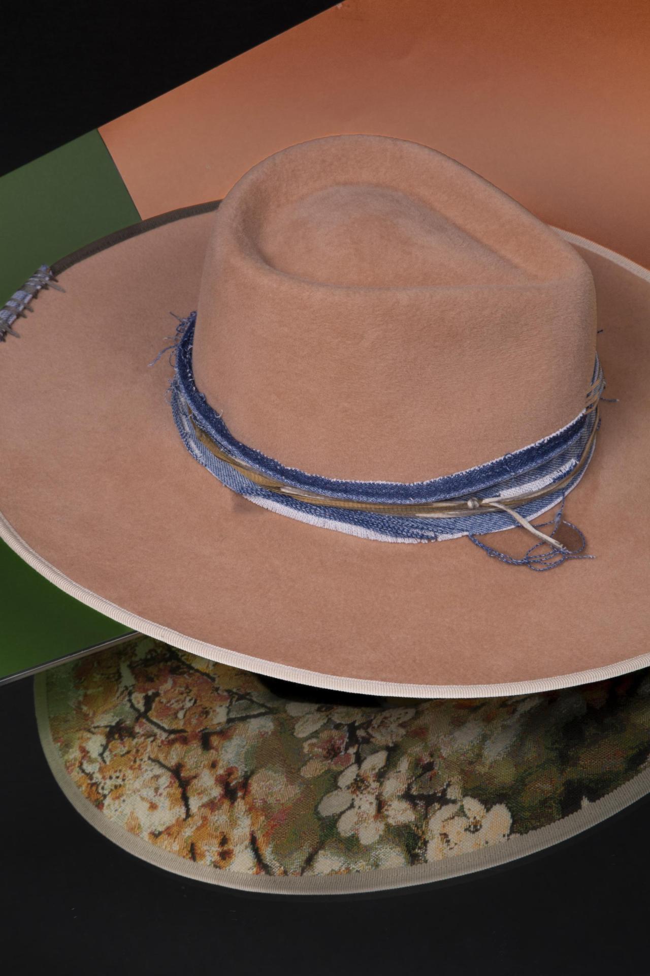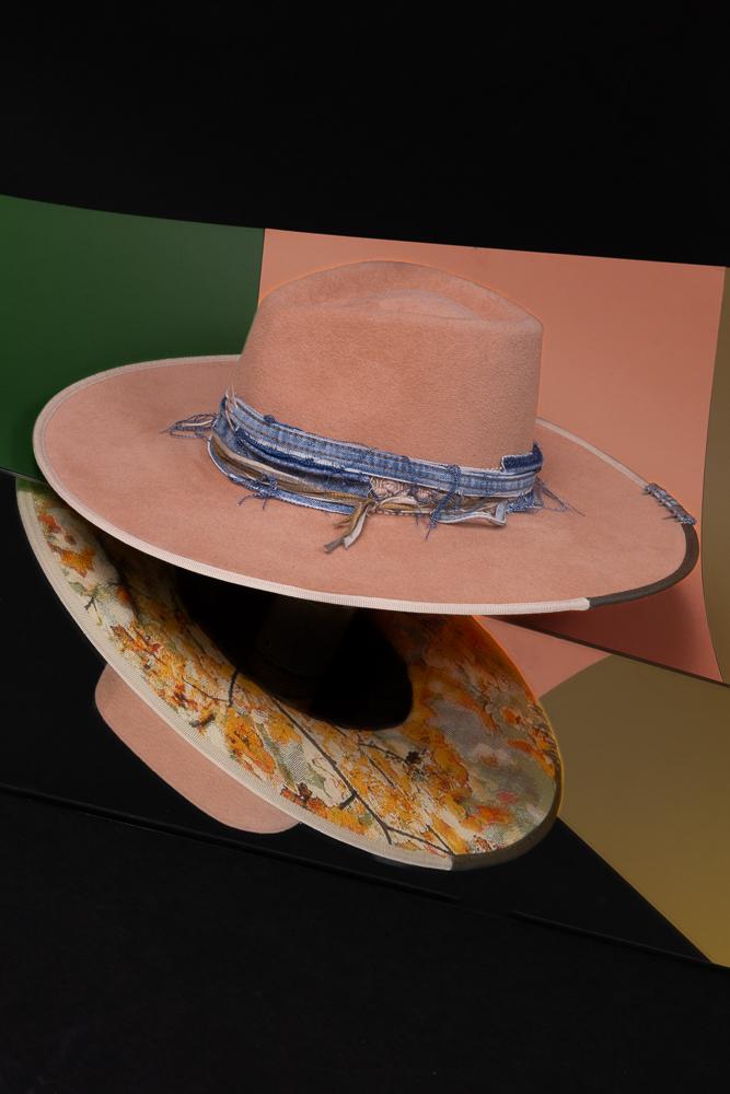 Chapeau Textile Artistique,Fusion Camel, Denim et Tapisserie Florale