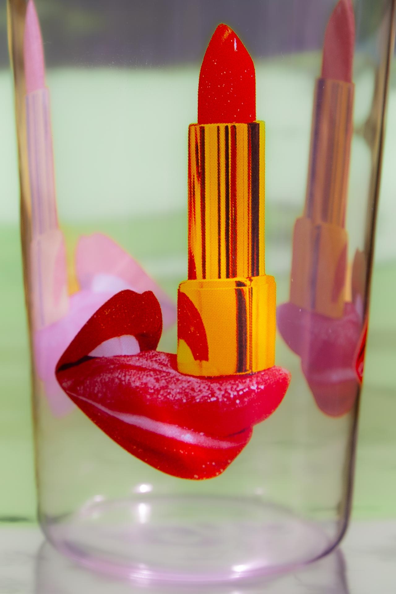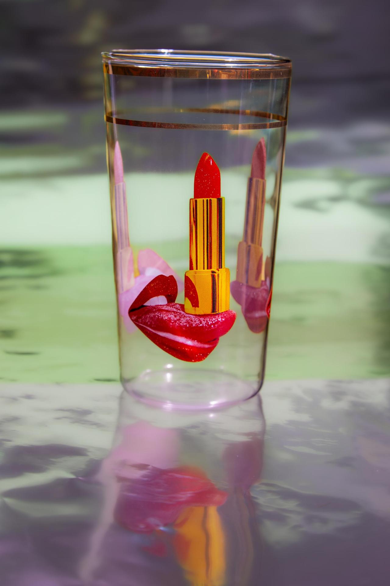 Un verre transparent orné d’un rouge à lèvres vif et de lèvres scintillantes, idéal pour celles et ceux qui aiment un style beauté audacieux.