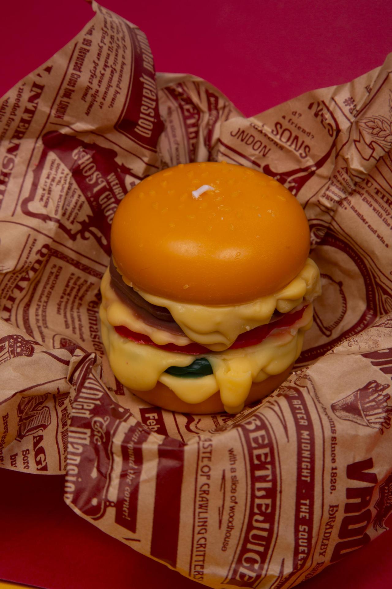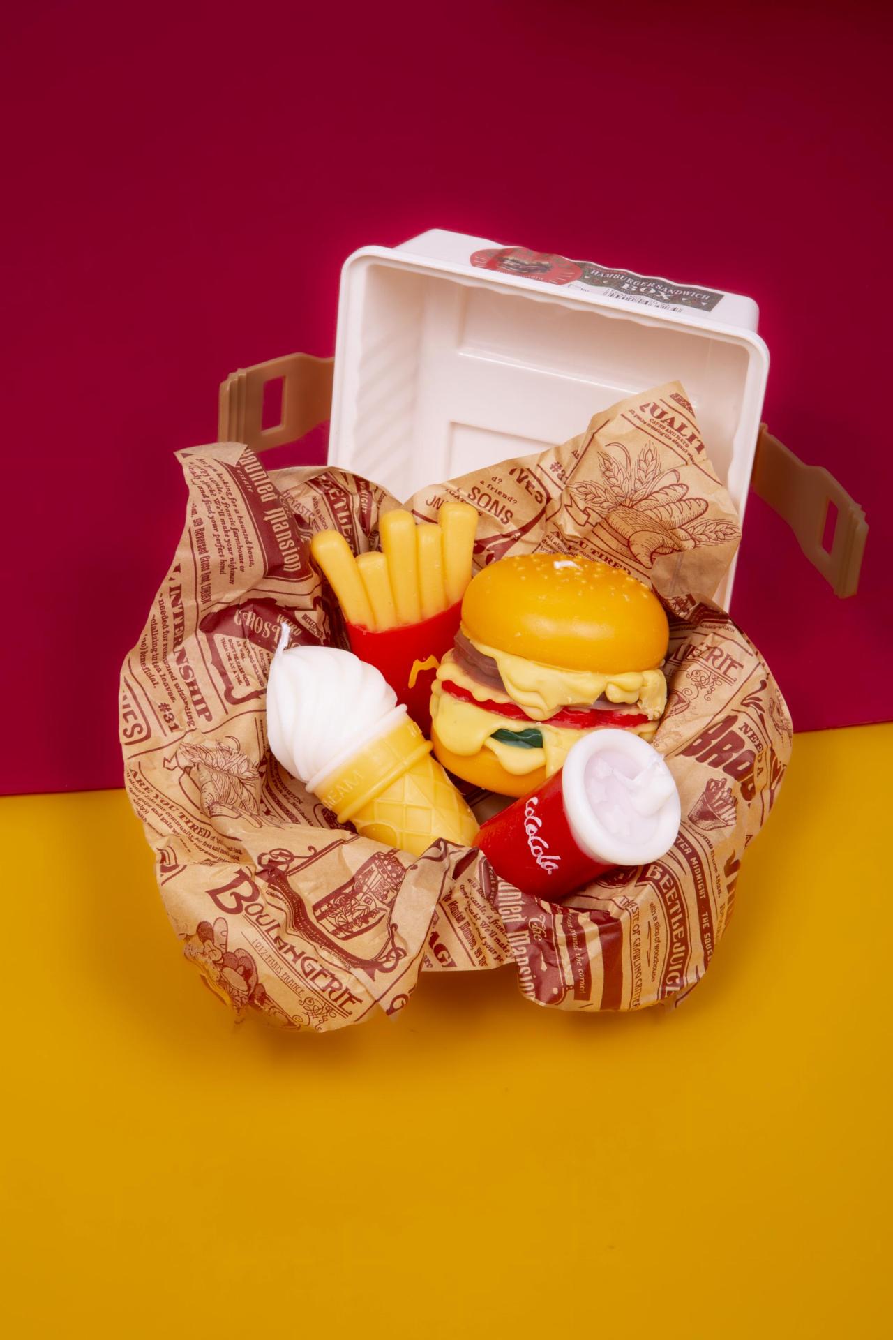 Un set de bougies façon fast-food avec burger, frites, glace et soda, fun, décalé et ultra réaliste.