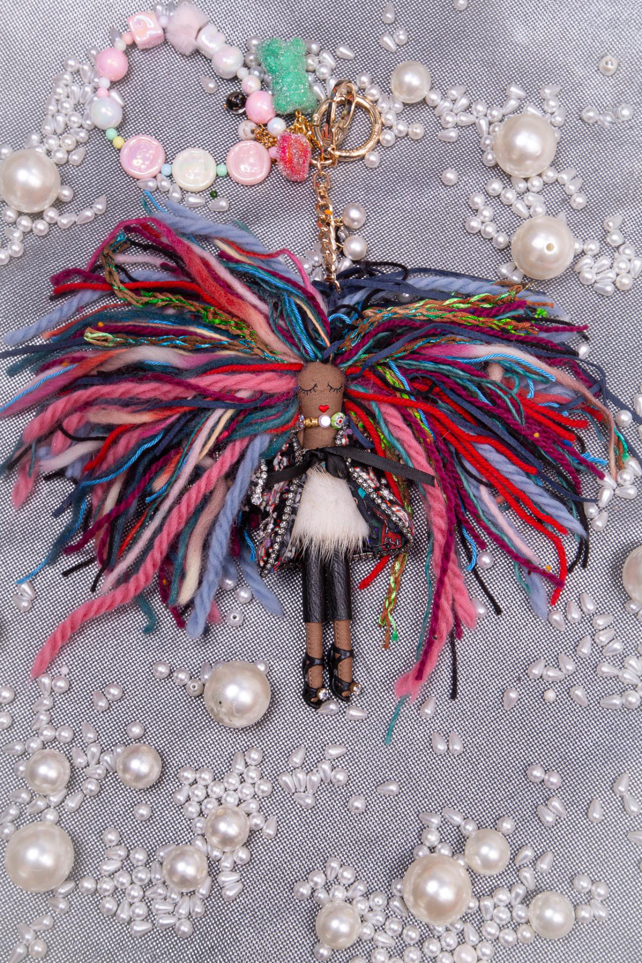 Un porte-clés Eva fait à la main, avec des cheveux en fils multicolores, une tenue brodée, des perles et des textures ludiques. Une pièce colorée, artistique et pleine de charme.
